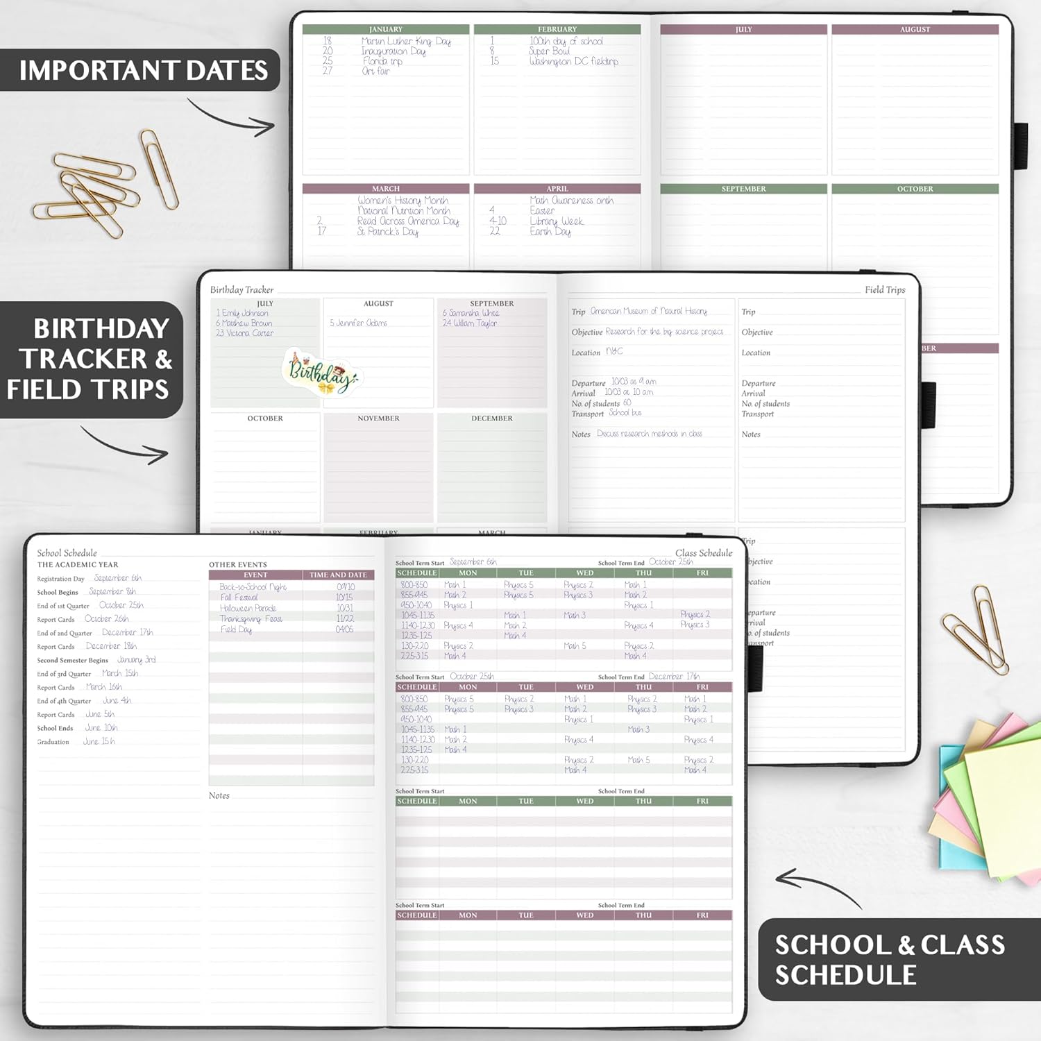 - STORE ALL HELPFUL INFORMATION IN ONE PLACE – At the front of the school year planner, you will find sections for important dates, birthdays, field trips, teaching goals, professional development events, passwords, student contacts and health information.