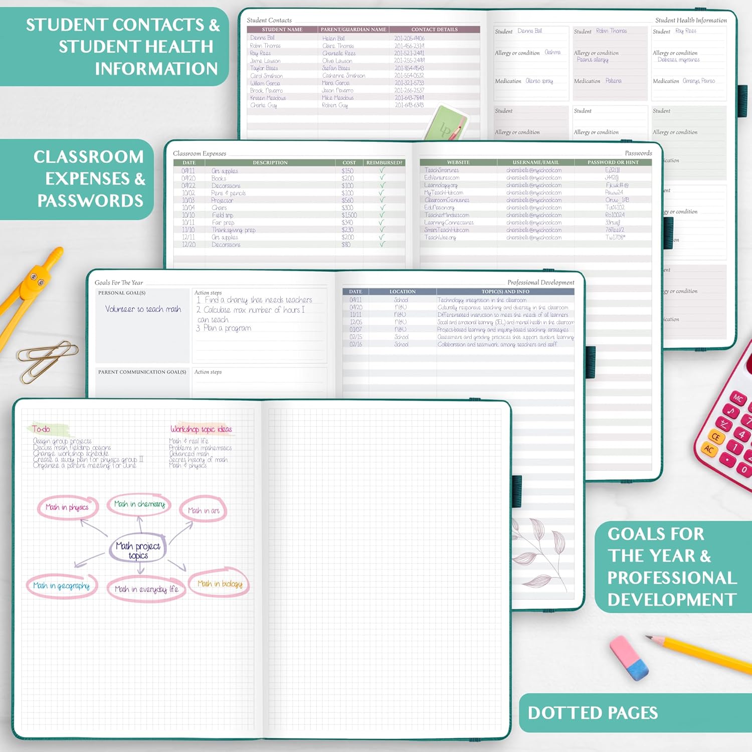 - STORE ALL HELPFUL INFORMATION IN ONE PLACE – At the front of the school year planner, you will find sections for important dates, birthdays, field trips, teaching goals, professional development events, passwords, student contacts and health information.