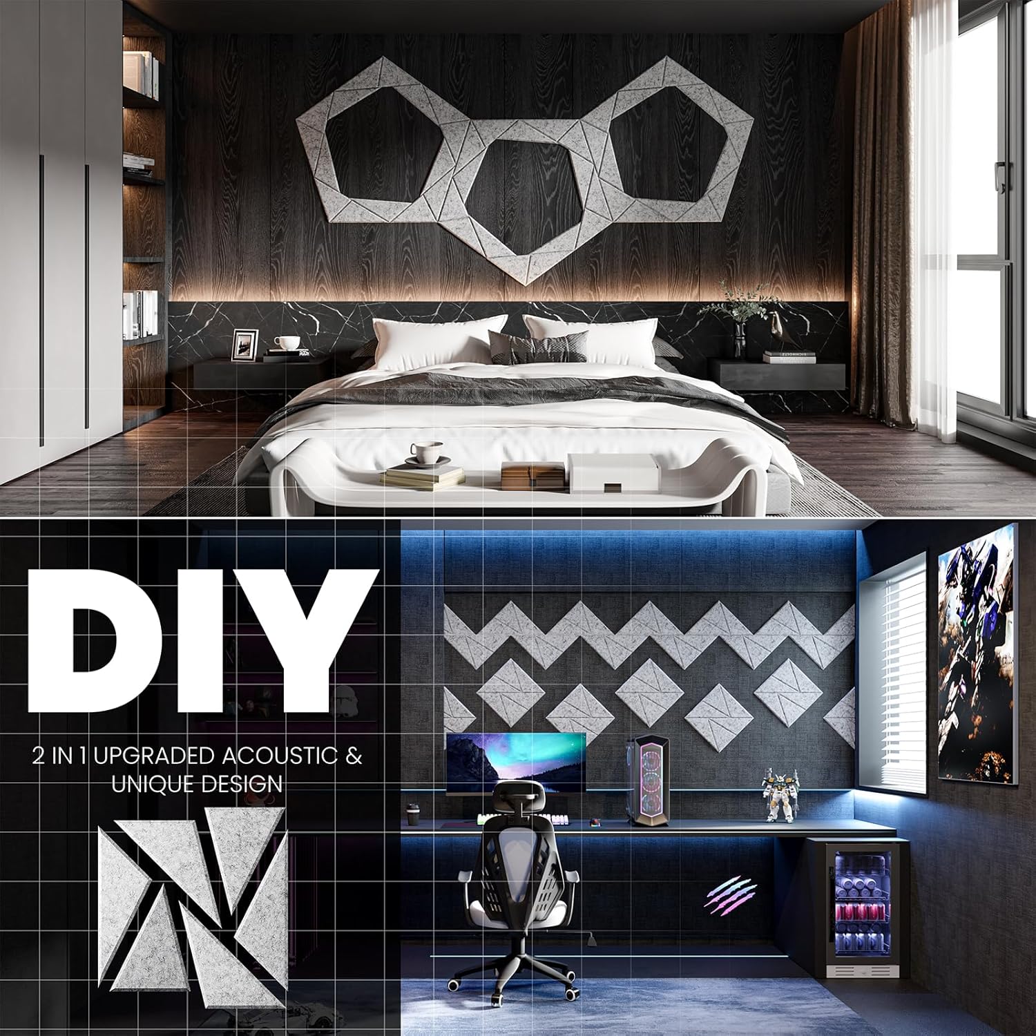 - 👍【Perfect for wall decoration】Be different from other acoustic panels,We have not only upgraded their acoustic performance,but aslo their appearance.Adopt beveled edge and multi-line design.They can be DIY into pinwheel patterns and multi-ring patterns.They absorb unnecessary sound while playing a good role in decorating the wall.Perfect for professional studios, video blogger,game room, podcasting, school,home theaters,offices,etc.