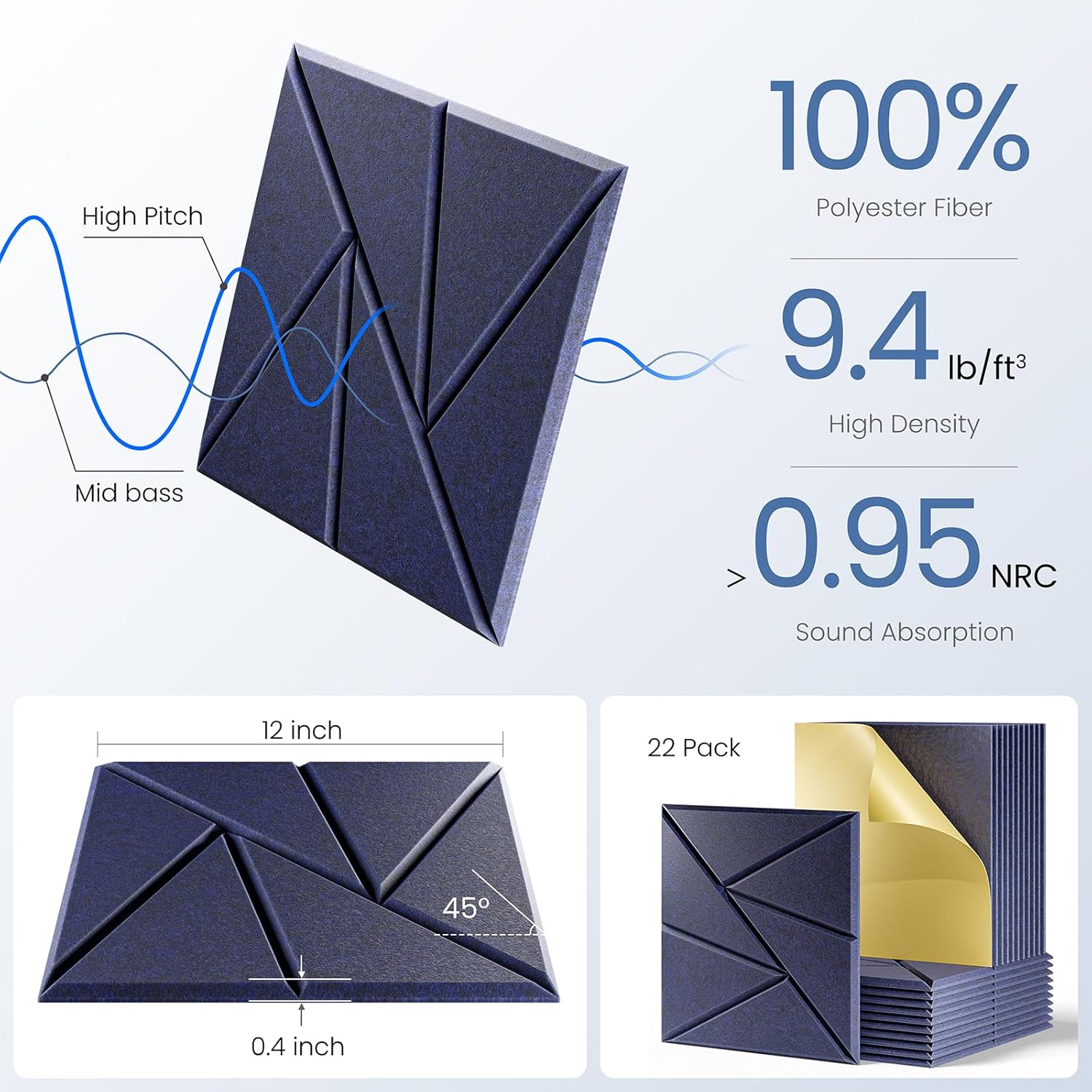 22 pack Acoustic Panels With Self-Adhesive, 12"X 12"X 0.4"Sound Proof Foam Panels, Sound Panels High Density, Soundproof Wall Panels for Home Studio Office-Dark Blue