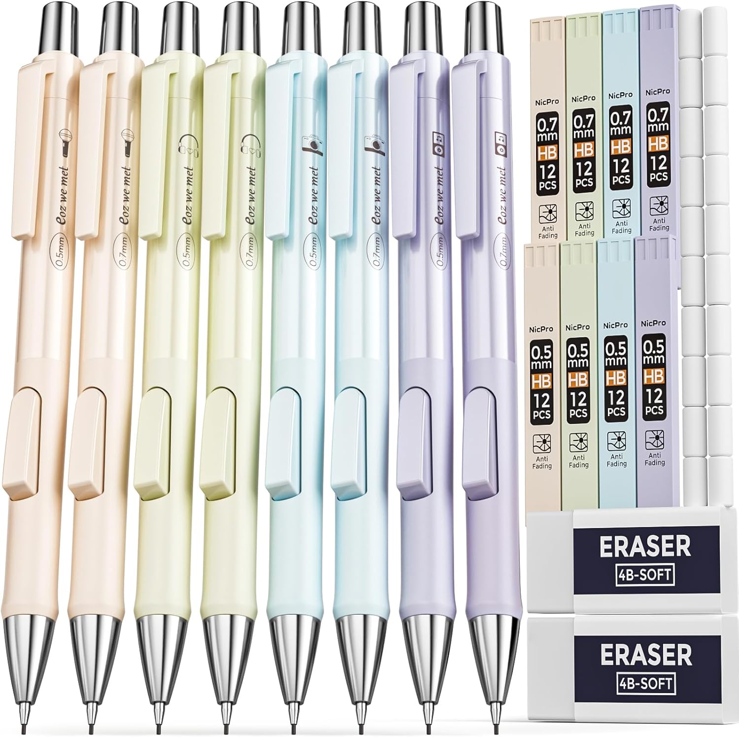 Nicpro 8PCS Pastel Mechanical Pencil 0.5 & 0.7 mm, Cute Fast Click Mechanical Pencils Set with 8 Tubes HB Lead Refills, Erasers for Drafting, School Student Writing, Drawing, Sketching -with Case
