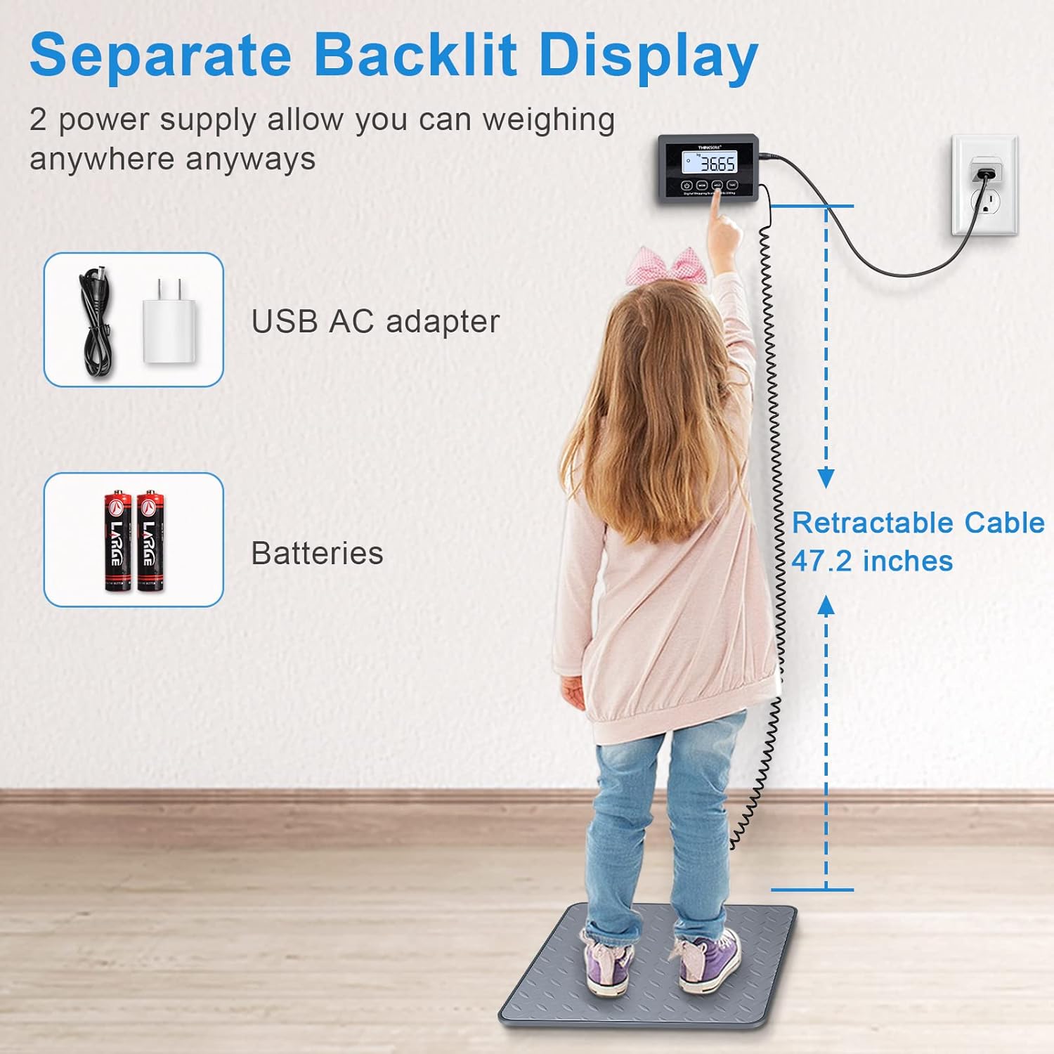 - BRIGHT LCD DISPLAY & 2 POWER: THINKSCALE postage scale will not turn off automatically by default, Back-lit LCD display is easy to read and can be moved with the connected cable for clear visibility when weighing large items, and it has two rear pin slots for wall mounting or other heights. It support powered by batteries or USB DC adapter both included.