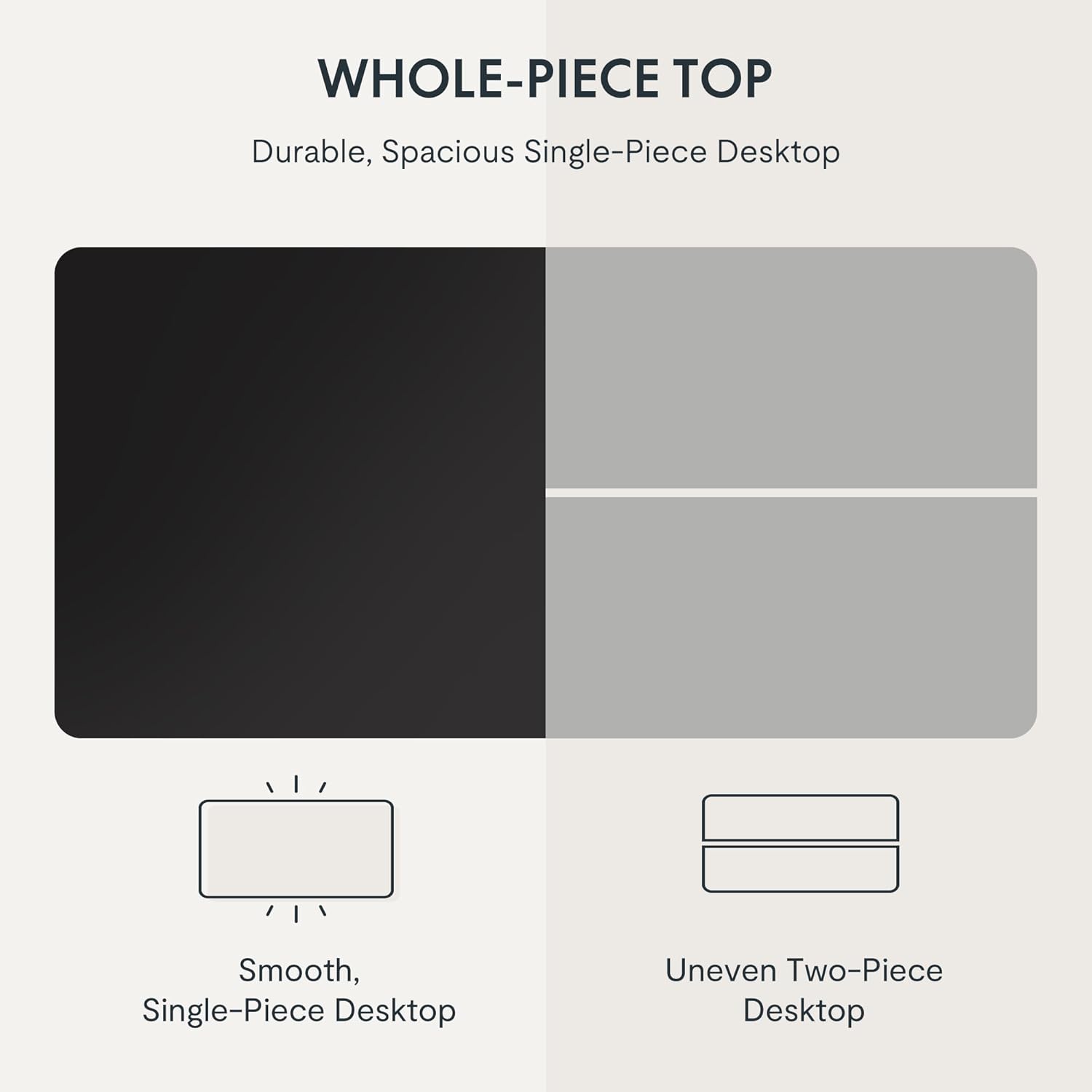 - 【COZY & ERGONOMIC WHOLE-PIECE WORKSPACE】 The spacious 55.1” x 27.5” whole-piece desktop offers ample room for two monitors and a laptop, allowing you to spread out and tackle your workday with ease.