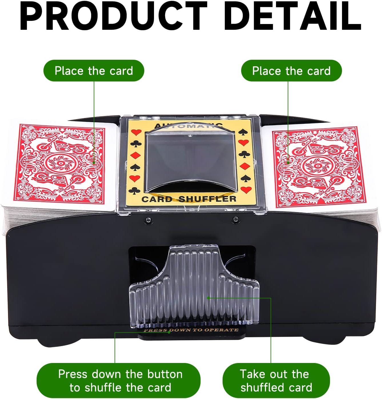 - 【Great Choice for Card Game】Made with the strongest ABS material, Unniweei automatic card shuffler with high shuffling speed is perfect for Casino Card Game for Poker, Home Card Game, UNO, Phase10, Texas Hold'em, Blackjack, Home Party Club Game. The card shuffler can quickly and smoothly scramble the playing cards and collect them into the tray. After inserting the cards into the openings on both sides of the product, they will be automatically shuffled with a single push of the button.