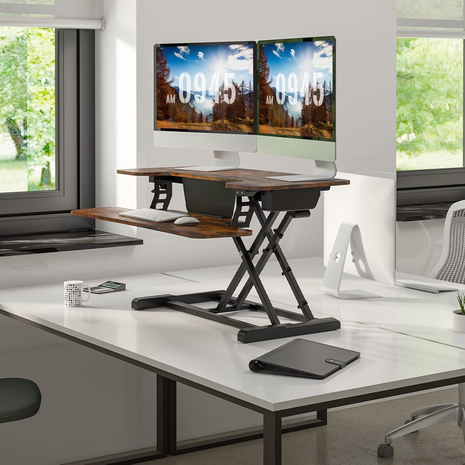 - Great for Reading and Typing - With a spacious upper desktop that can accommodate dual monitors or a laptop and monitor setup, and a roomy lower tier designed to hold a standard keyboard and mouse or 13" laptop, this standing desk riser is perfect for reading, typing, and multitasking.
