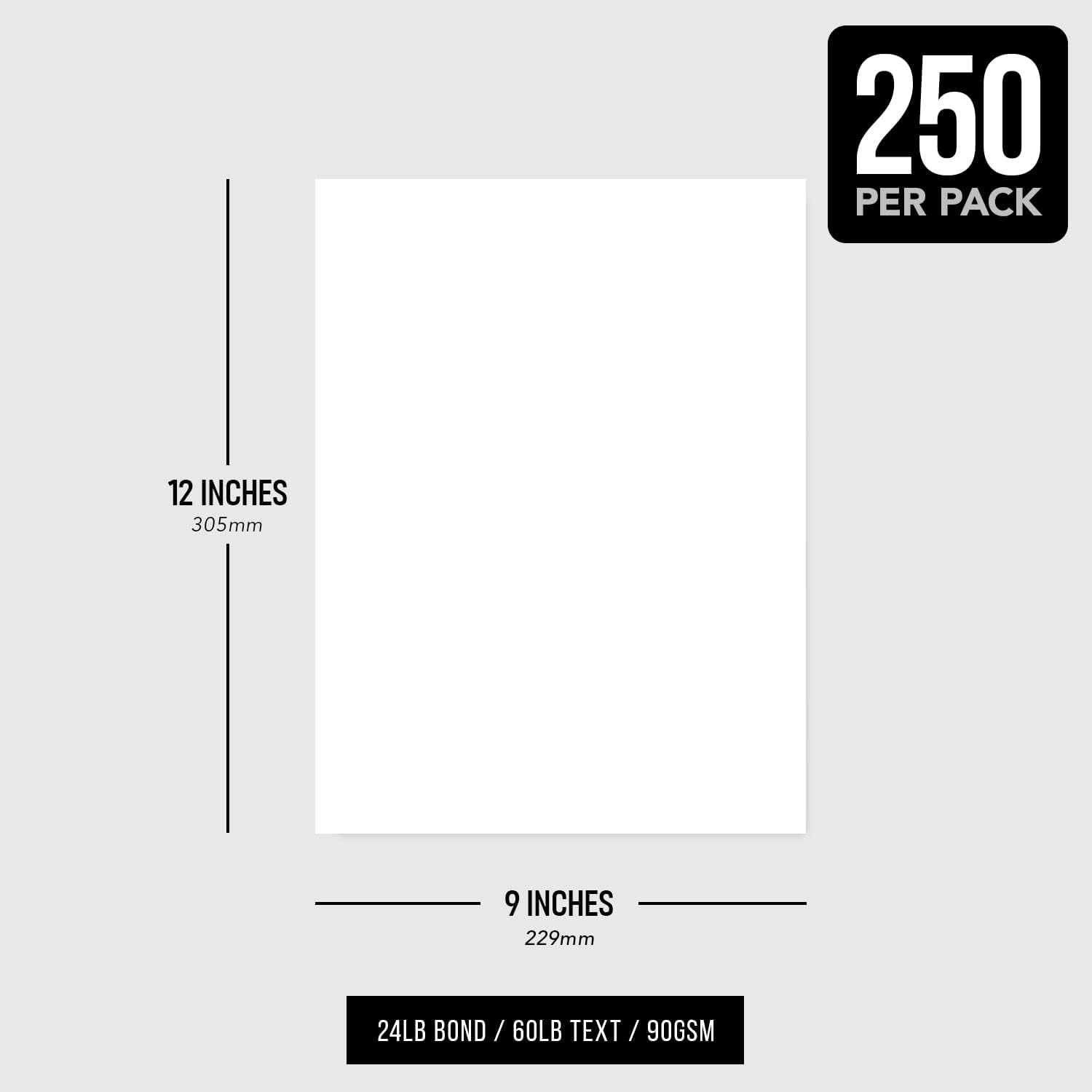 9" x 12" White Regular Paper – Multipurpose Office Paper for Copy, Printing and Writing | Inkjet and Laser Printer Compatible | 24lb Bond / 60lb Text / 90gsm – Smooth Finish | 250 Sheets per Pack