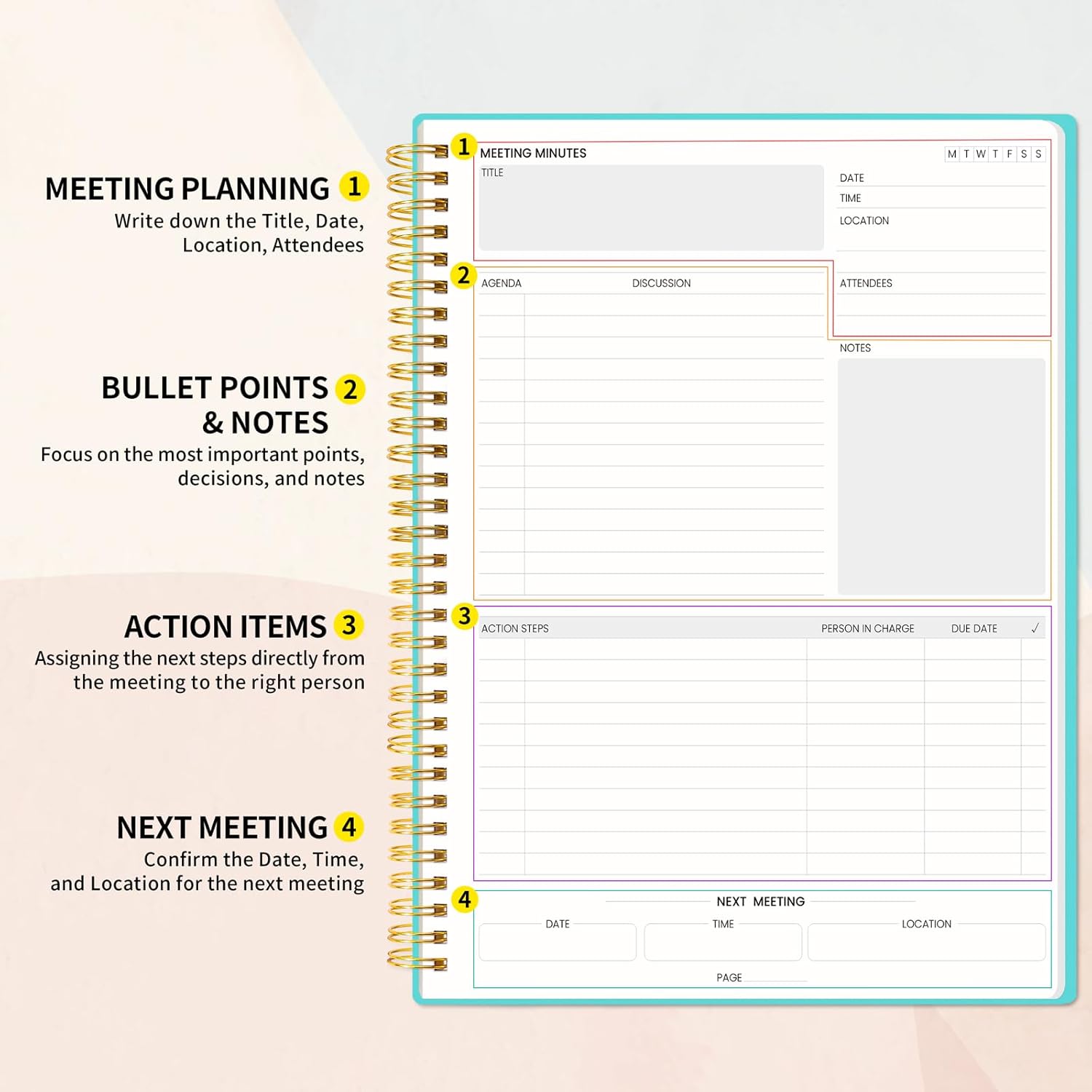 - Meeting Notebook with Action Items: 1.MEETING PLANNING: Date, Location, Title & Attendees 2.NOTES AREA 3.MEETING AGENDA: Discussion Items & Meeting Duration 4.ACTION ITEMS: Action Steps, Person, Due Date & Check Box 5.NEXT MEETING: Date, Time & Location 6.INDEX PAGE: Date, Title, Page Number, which will help create more effective meetings and good results.