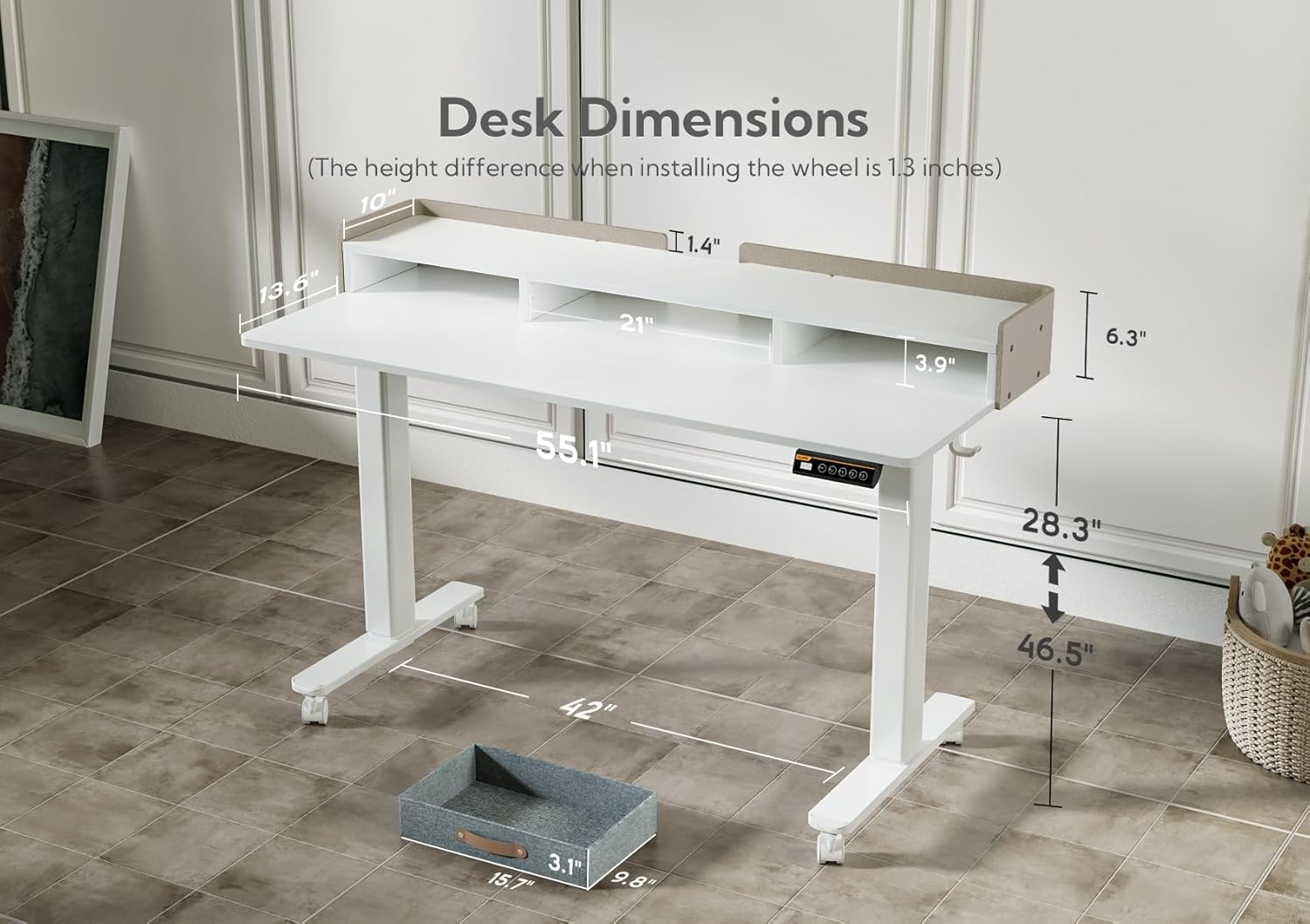 - Smooth Height Adjustment: Choose your ideal standing desk height freely, ranging from 28.35" to 46.46". You can also save your 3 favorite settings and smoothly switch between them using the electric standing desk