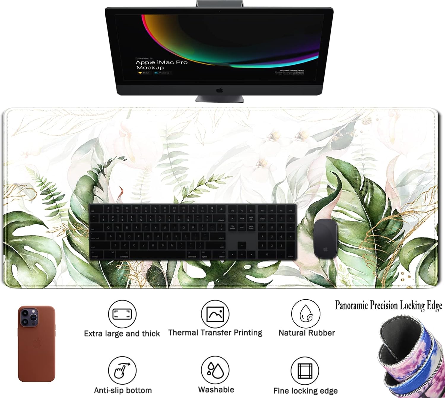 Green Tropical Leaves Desk Mat XL Large Gaming Mouse Pad Green Sage Plant Laptop Keyboard Mouse Mat Office Supplies Desk Decor Accessories for Women, Desk Mats Pads on top of Desks, 31.5x11.8 in