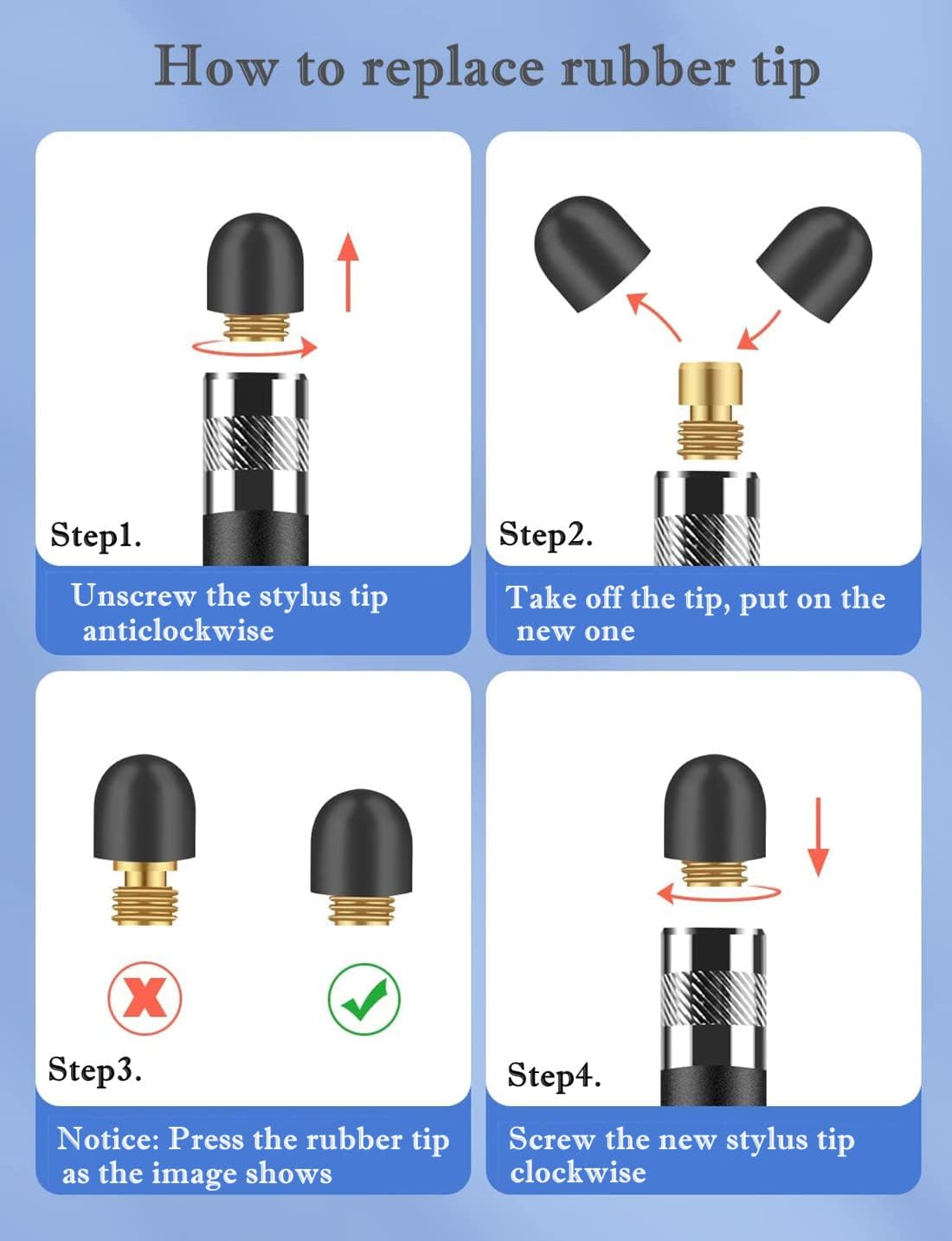 - 【Easy to replace rubber tips】Both two ends of rubber tips are replaceable. Replacing can be done within seconds without any tool, Package contains 2* stylus Pens and 4 replaceable rubber tips included (2* 0.20'' rubber tips and 2* 0.27'' rubber tips).