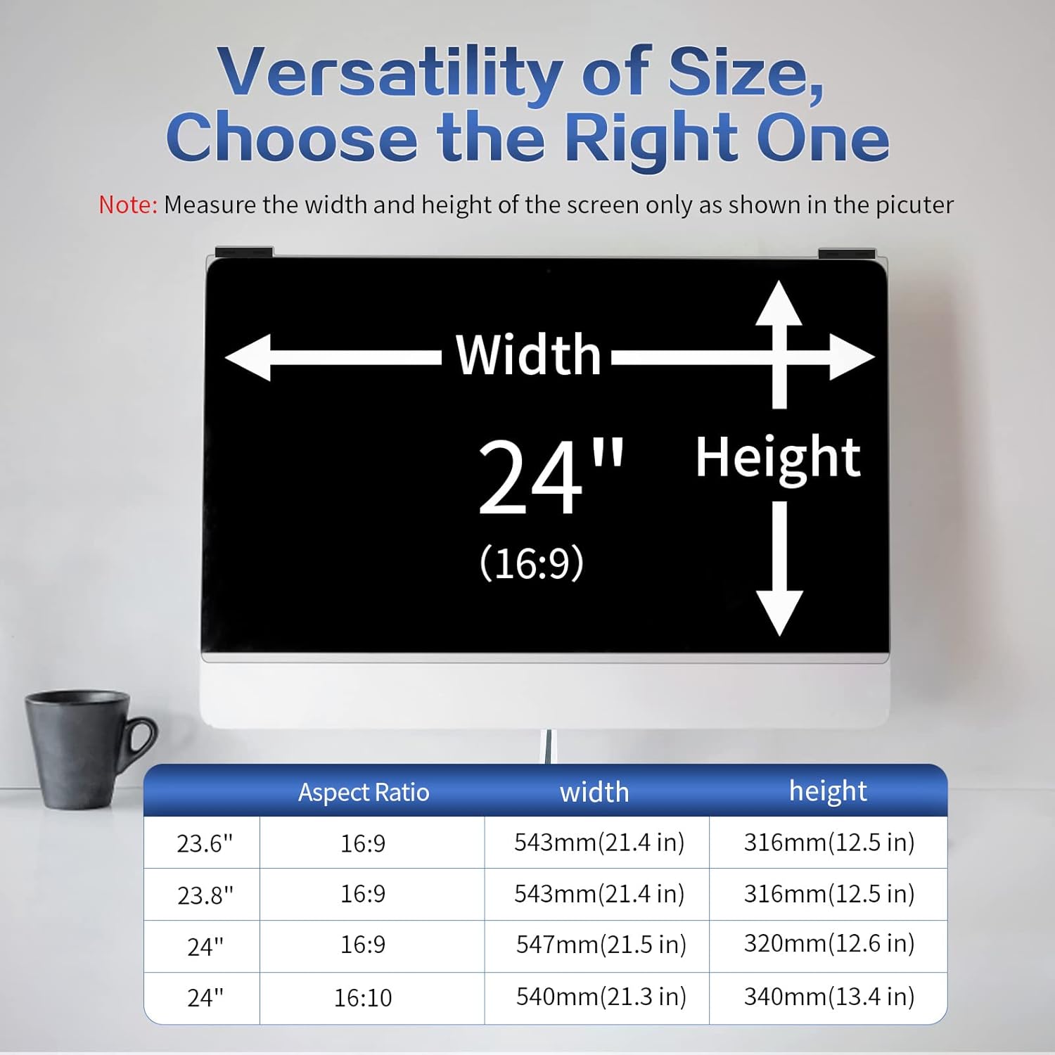 - 【Variety of Size】: The computer privacy screen filter perfectly fits for 24 inch widescreen monitor with an aspect ratio of 16:9 and 16:10. It is also compatible with the privacy screen of 23.6 and 23.8 inch monitor. To determine the right size of your screen, measure the height and width of your screen without the boarder. If you have any problems with the size, please contact us directly.