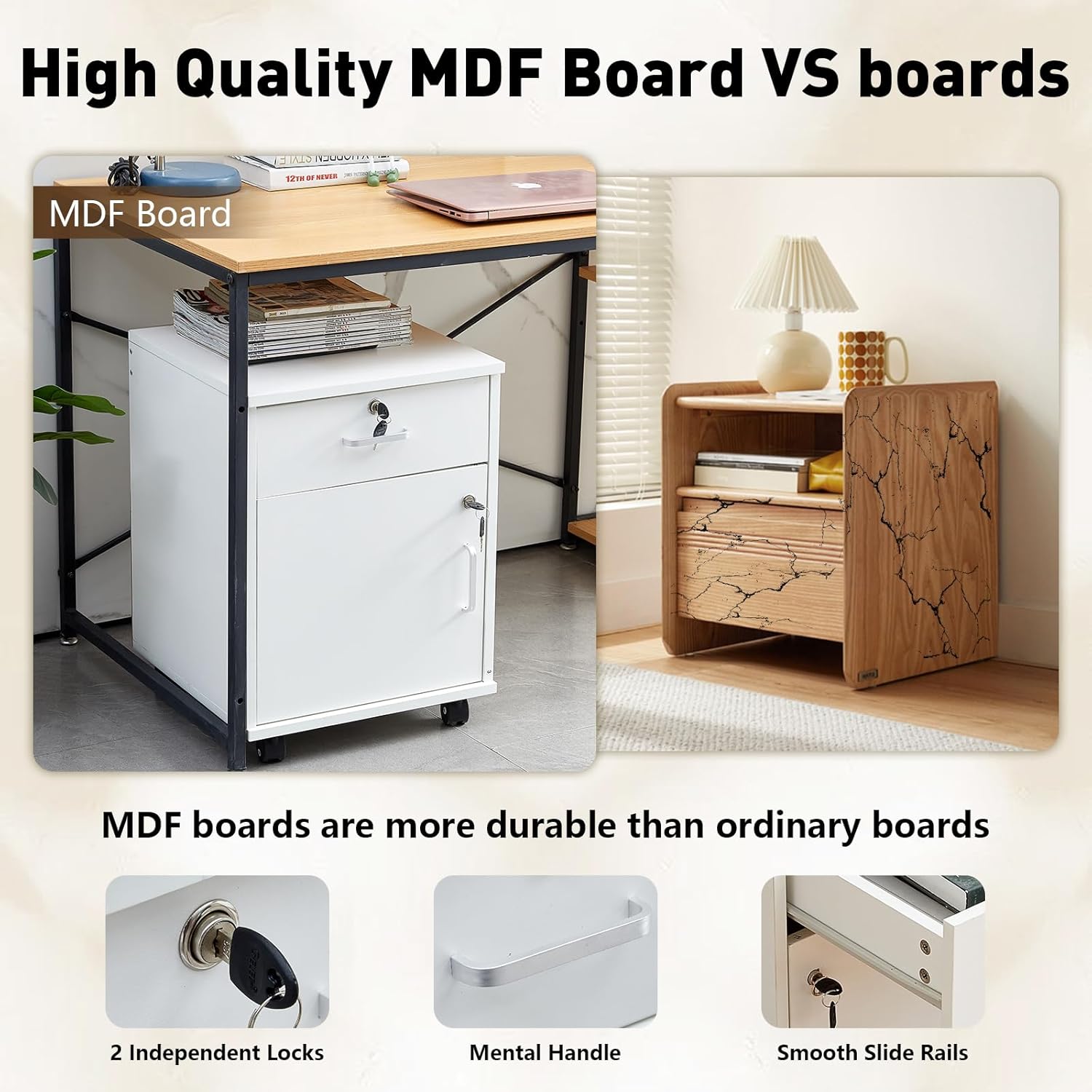 TUKAILAi Mobile File Cabinet with Lockable Drawer & Door, Under Desk Rolling Filing Cabinet with 4 Wheels, Wooden Stationery Storage Cabinet for Home Office (White)