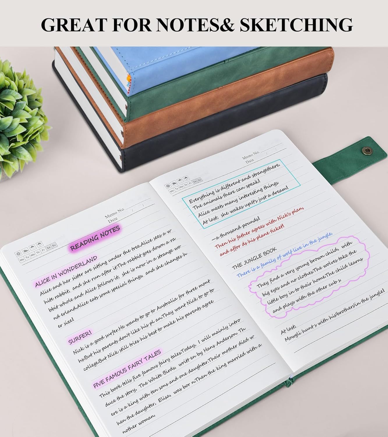 - 【CONVENIENT FEATURES FOR ORGANIZATION】:The leather journal includes 3 ribbon bookmarks, allowing you to easily mark important pages or sections. The 180° lay-flat design ensures that the notebook lies flat on any surface, making it comfortable to write in for extended periods. The metal snap closure design keeps the notebook securely closed, protecting your notes from damage.These features make the notebook a versatile tool for various settings, from work and school to personal use.