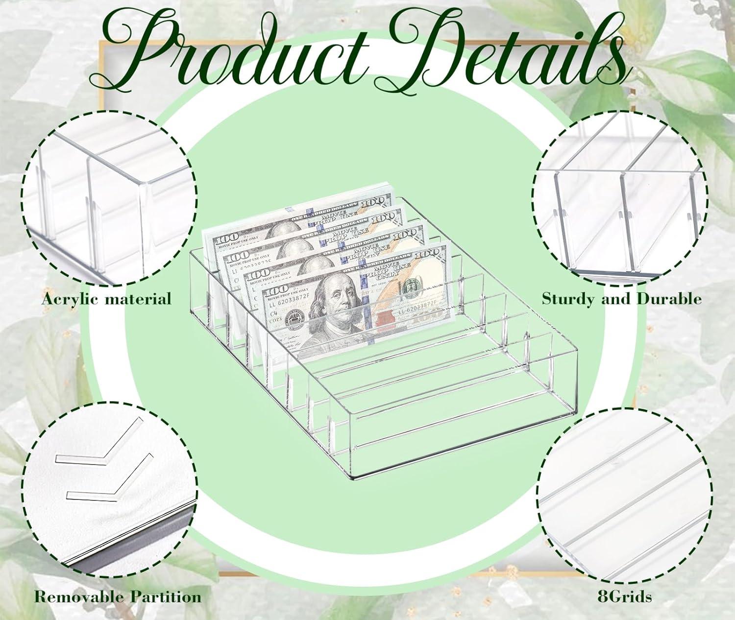 - Package includes: 8-grid clear acrylic cash organizer can meet your need to place enough cash and keep it neat and orderly. It is very convenient for you to make a budget, and can also store data cables.