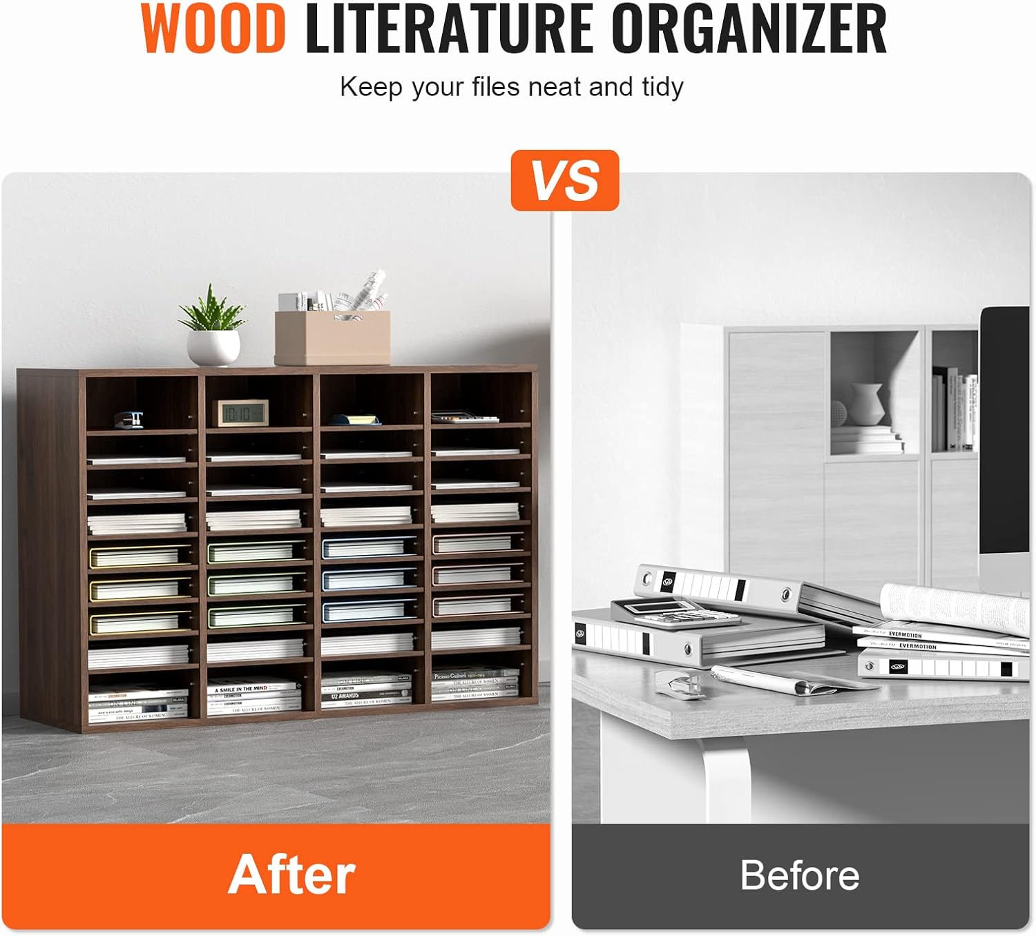 - Maximize Your Space: Say goodbye to cluttered desktops with VEVOR wood literature organizer. It has 36 compartments in total, arranged in 9 rows and 4 columns. You'll have ample space to store and organize books, documents, magazines, papers, and other materials. Keep your workspace neat and tidy with ease.