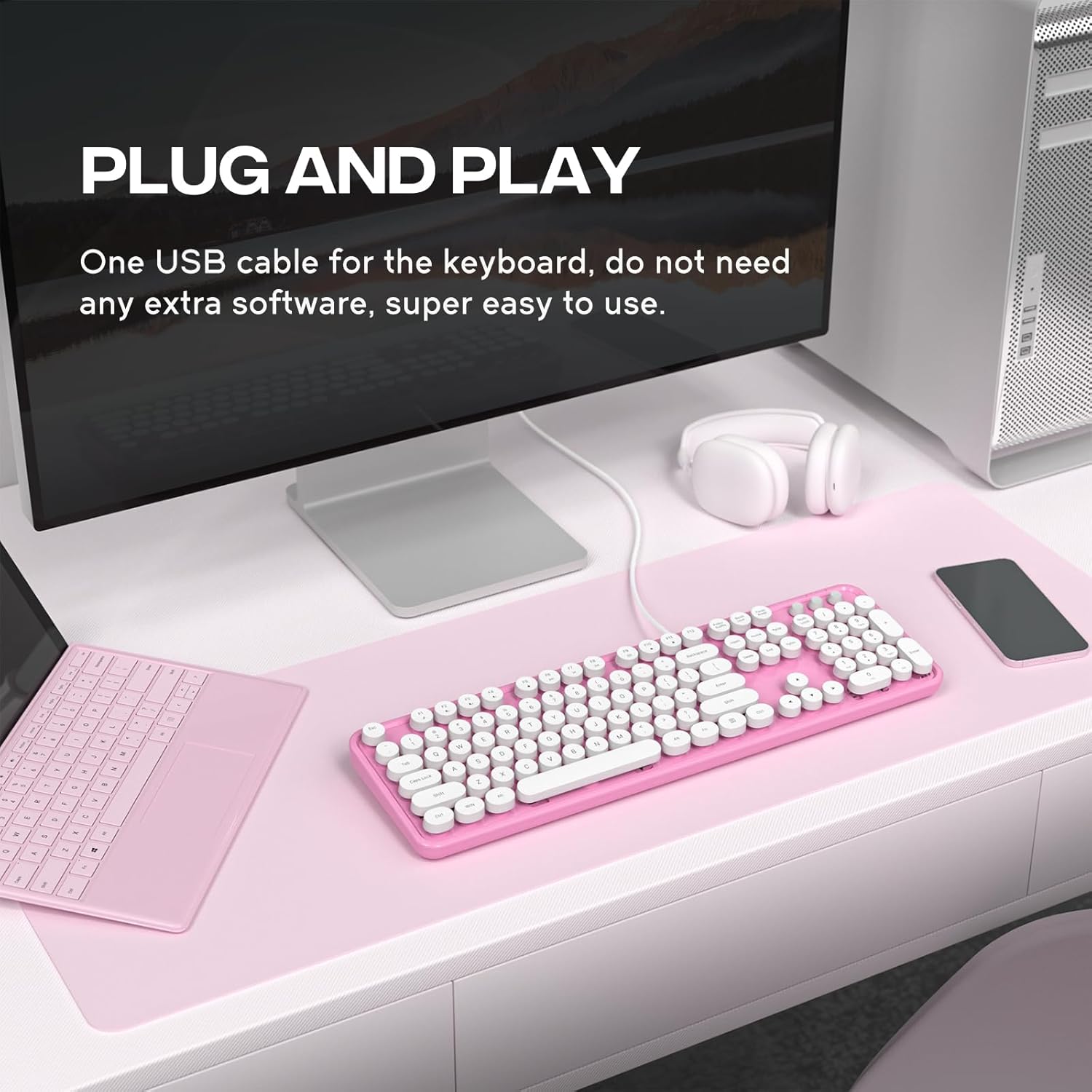 - 【Retro Typewriter Keyboard】Cute round keycaps, crisp and sweet sound, perfect knocking feel, let you find the feeling of a retro typewriter. And it’s detachable, making the keyboard easy to clean.