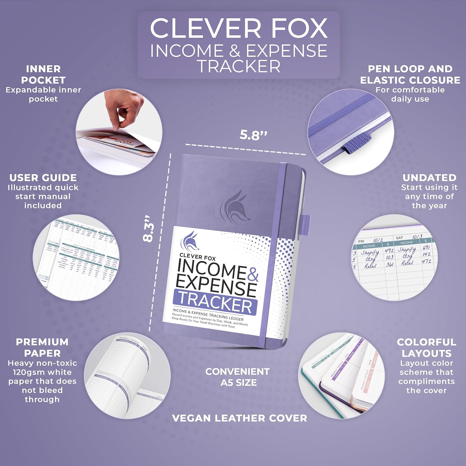 Clever Fox Income & Expense Tracker – Accounting & Bookkeeping Ledger Book for Small Business – 1-Year Record Notebook, A5 (Lavender)