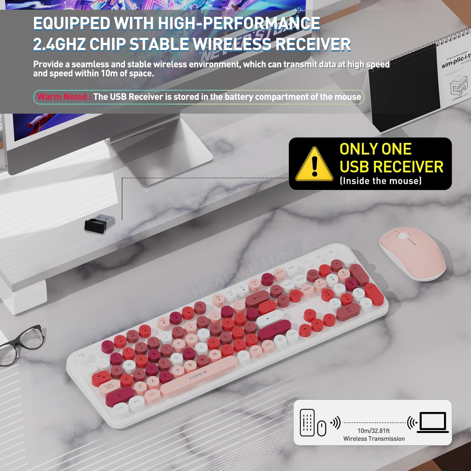 - Cute Wireless Keyboard - Stable 2.4G Wireless Connection : Enjoy a powerful wireless connection with a range of up to 10 meters (393.7 inches) for the keyboard and mouse combo. They utilize a shared Nano receiver, conveniently stored at the bottom of the mouse, Plug and Play.eliminating the need for additional software installation.keeping your desk clean.Keyboard size 17.5 x 5.5 x 1.3 inch With 105 Keys. Mouse size is 4.1 x 2.5 x 1.0 inch. Keyboard net weight: 1.57LB,Mouse net weight: 0.15LB.