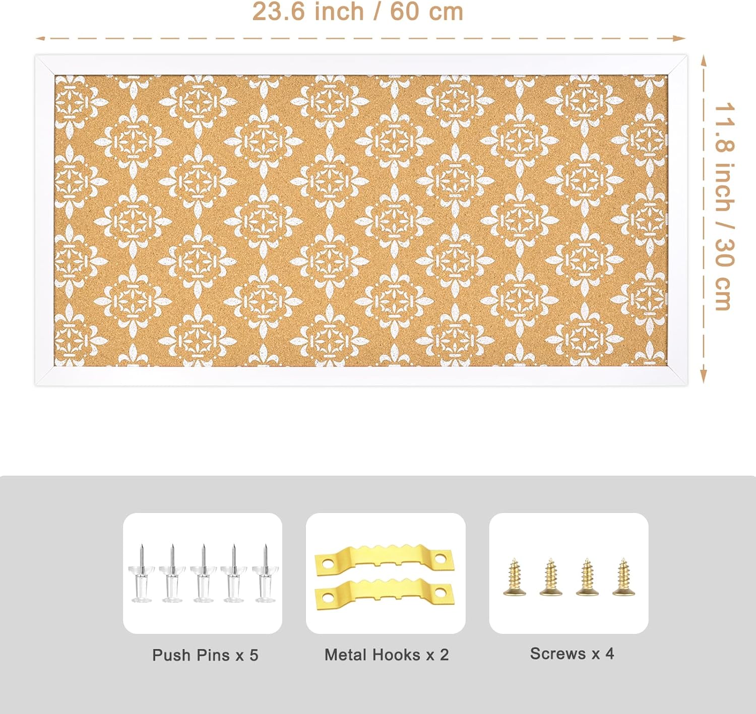 - Multi-Functional Bulletin Board(23.6x11.8 inches) - This bulletin board is made from printed cork, and is framed with white wood. The cork board is suitable for planning schedules, inspirations and chores organization. This pin board is suitable for pinning photos, menus, messages, weekly plan, memo, calendars, etc.