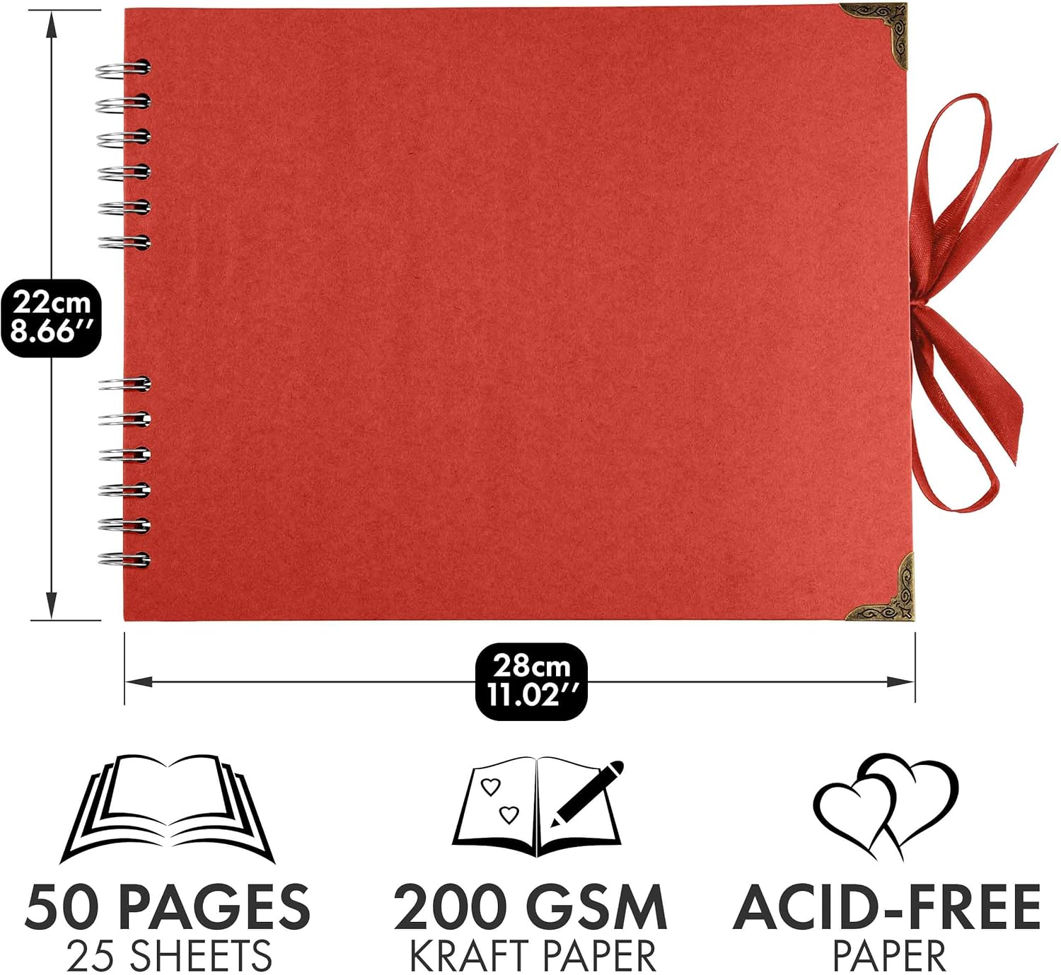 - This 11 x 8.5 Inches scrapbooks is durable and suitable for long term storage for you and your loved ones beautiful memories. It has 25 sheets, 50 pages of high quality thick paper, designed with ribbon closure, hard cover and corner protectors