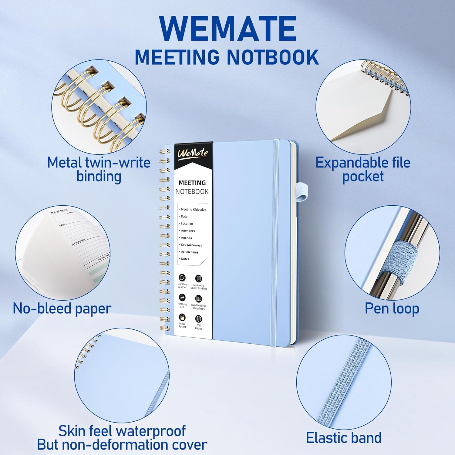 WEMATE Meeting Notebook for Work B5 (7"x10") - PU Leather Work Notebook with Agenda, Action Items & Notes - 200 Pages for Men&Women, Staff and Students, Meeting, Projects Planning - Light Blue