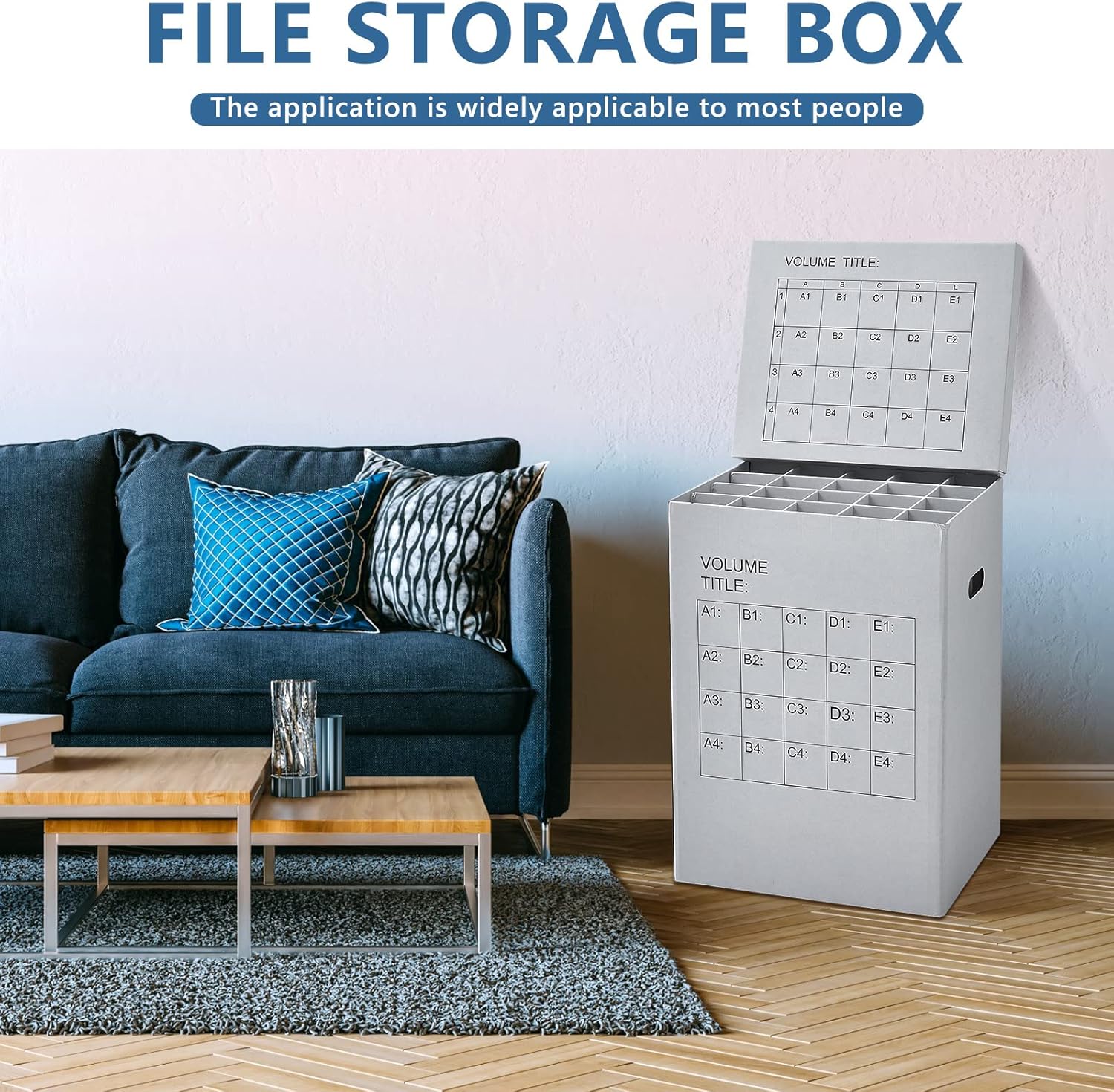 - 40 Slots : you will get 2 cardboard file boxes with lids, each measuring about 17.7 x 14.2 x 25 inches, each box is designed 4 x 5 with 20 slots , each Slot is approx. 3.54 x 3.54 inches, and can store items up to 25 inches high