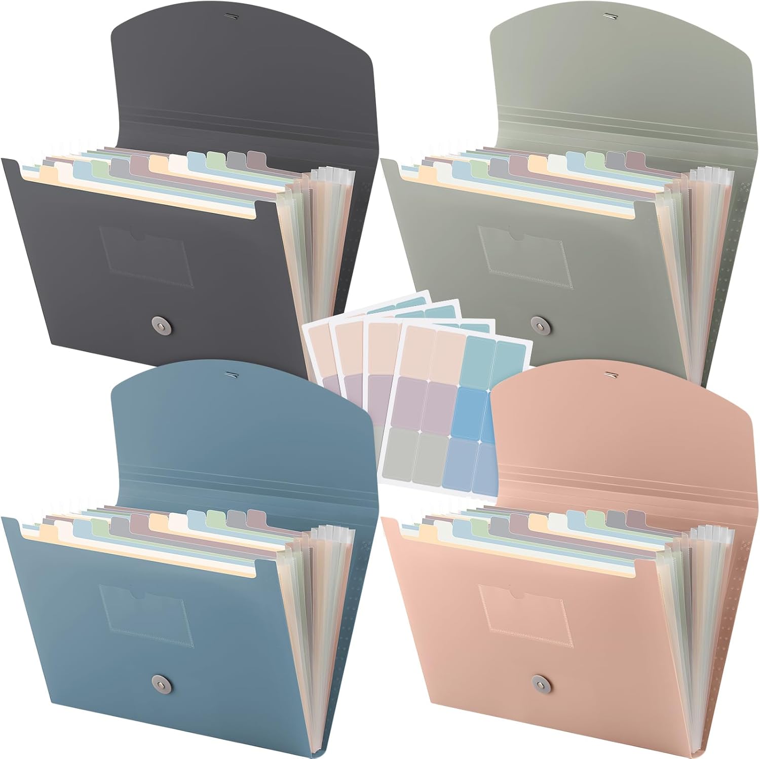 - Organize Your Documents with Ease: our file folder organizer is the nice solution for those who want to keep their documents sorted and easily accessible; With 13 pockets for storing various documents such as bills, statements, receipts, and more, you'll have no trouble finding what you need quickly; The 4 x expanding file folders come with 4 sheets of labels (12 pieces per sheet) that make it easy to label and identify each pocket