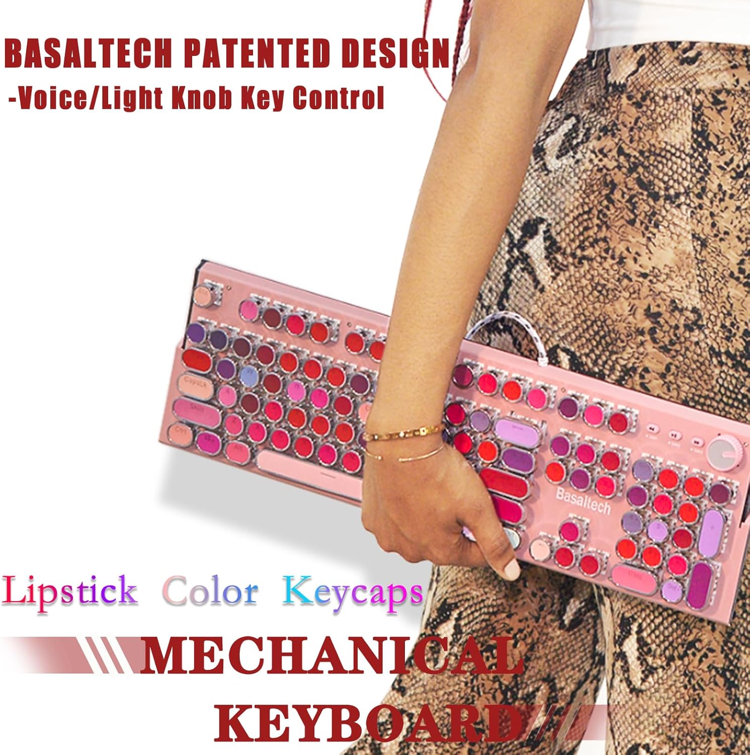 Basaltech Pink Keyboard Typewriter Style with White LED Backlight,Vintage Mechanical Gaming Keyboards with Lipstick Round Keycaps, Blue Switches 104-Keys Wired Keyboard Metal Panel for Laptop/pc