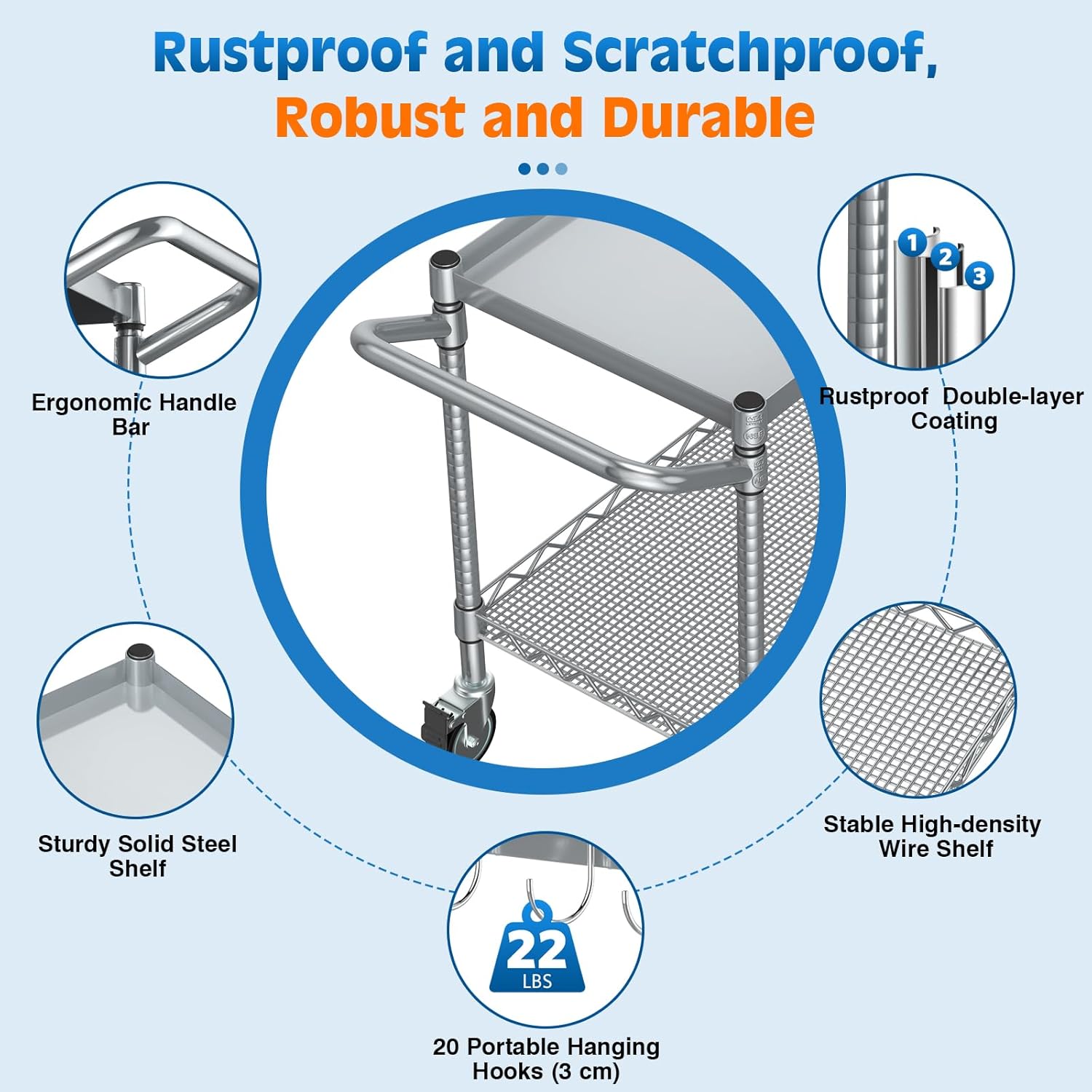 - 【Sturdy & Durable Material】With double-layer coating, the 2-tier rolling cart is rustproof and scratch-resistant. Fully made of quality metal, it's great in durability, high-temperature resistance, impact and deformation resistance, and other performances. You can use it both indoors and outdoors (outdoor use must be under fine weather conditions).