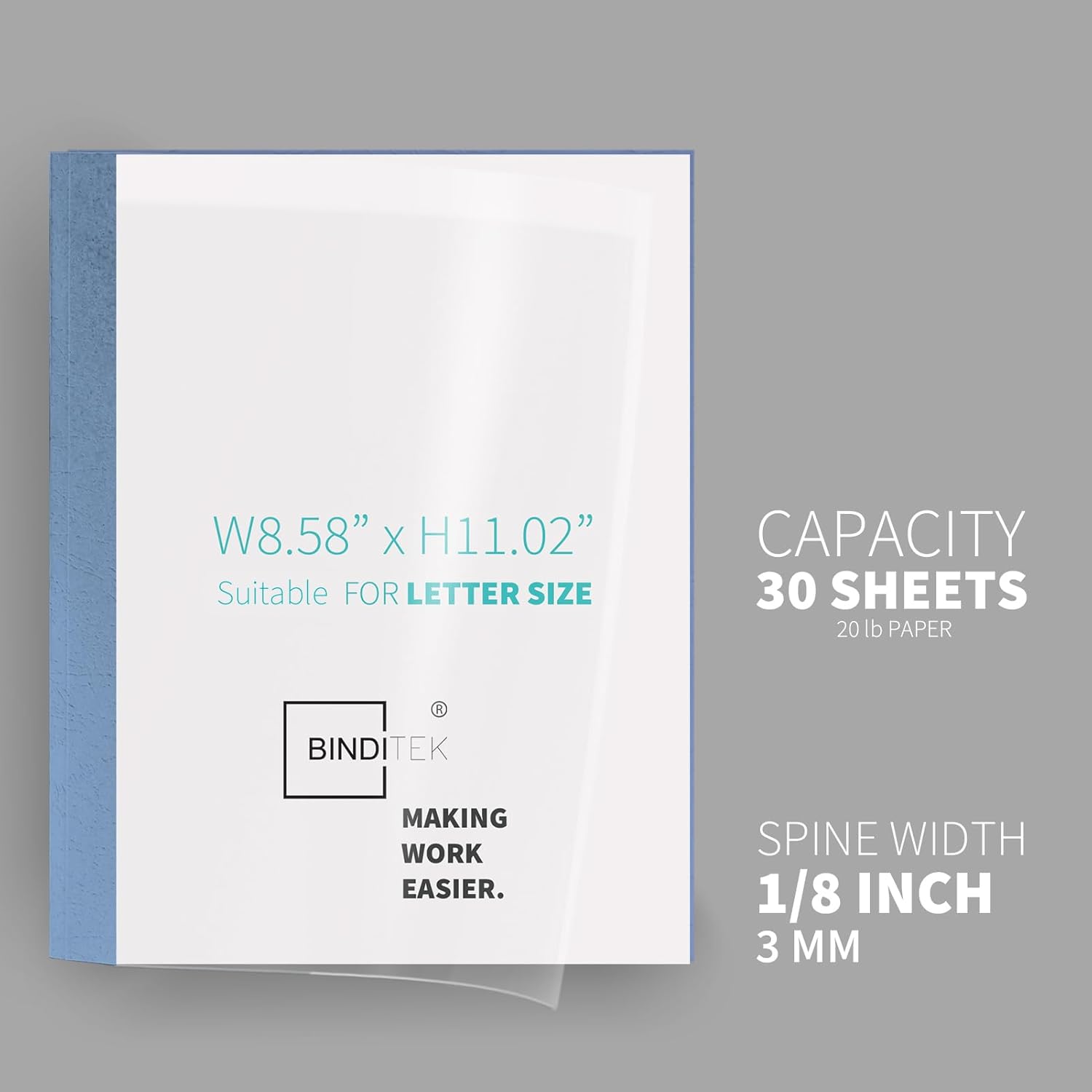 Binditek 10 Pack Thermal Binding Presentation Covers, 1/8 Inch Spine, Holds 30 Sheets, Ultra Clear Front Cover, Blue Paper Back Cover, Letter Size, for Students and Coworkers