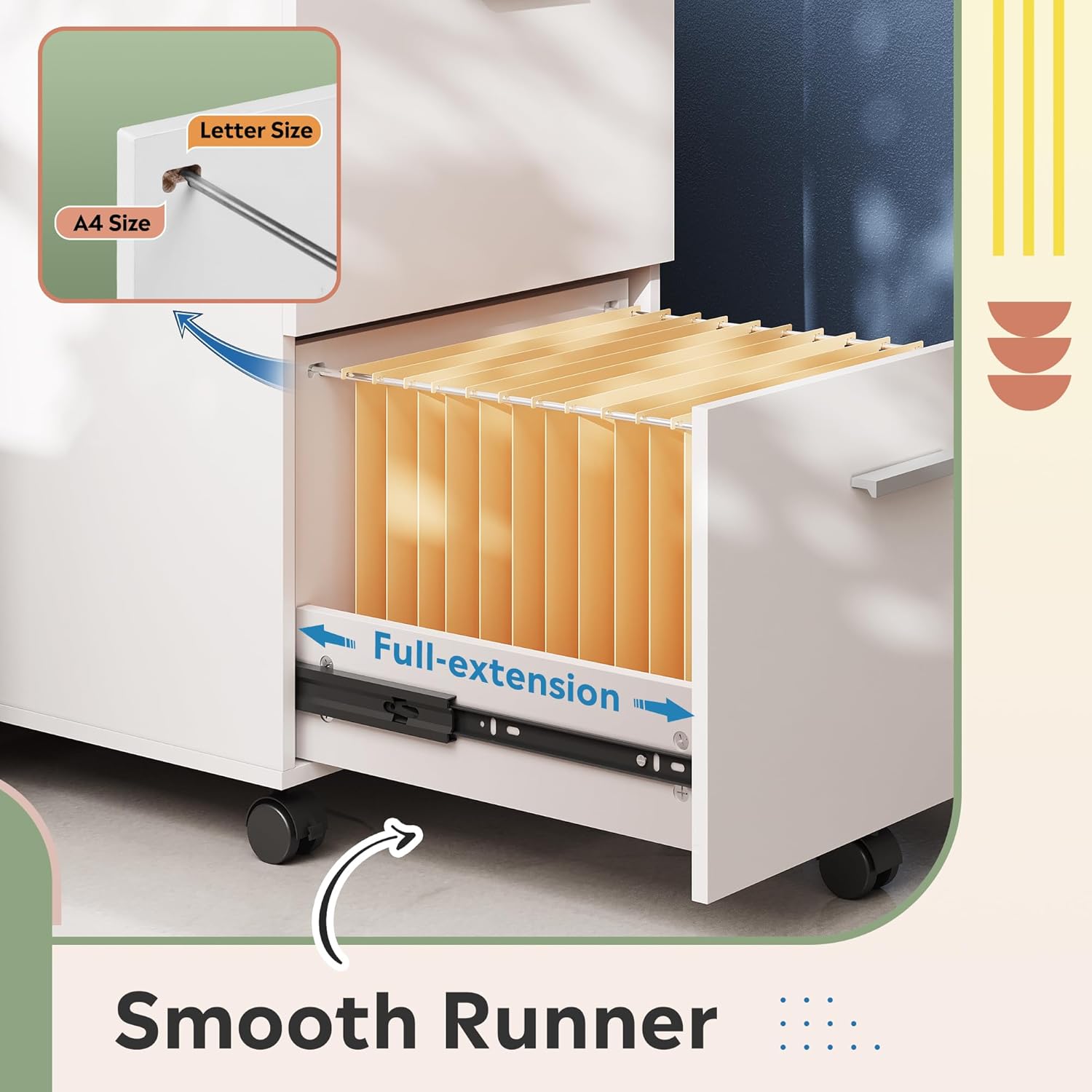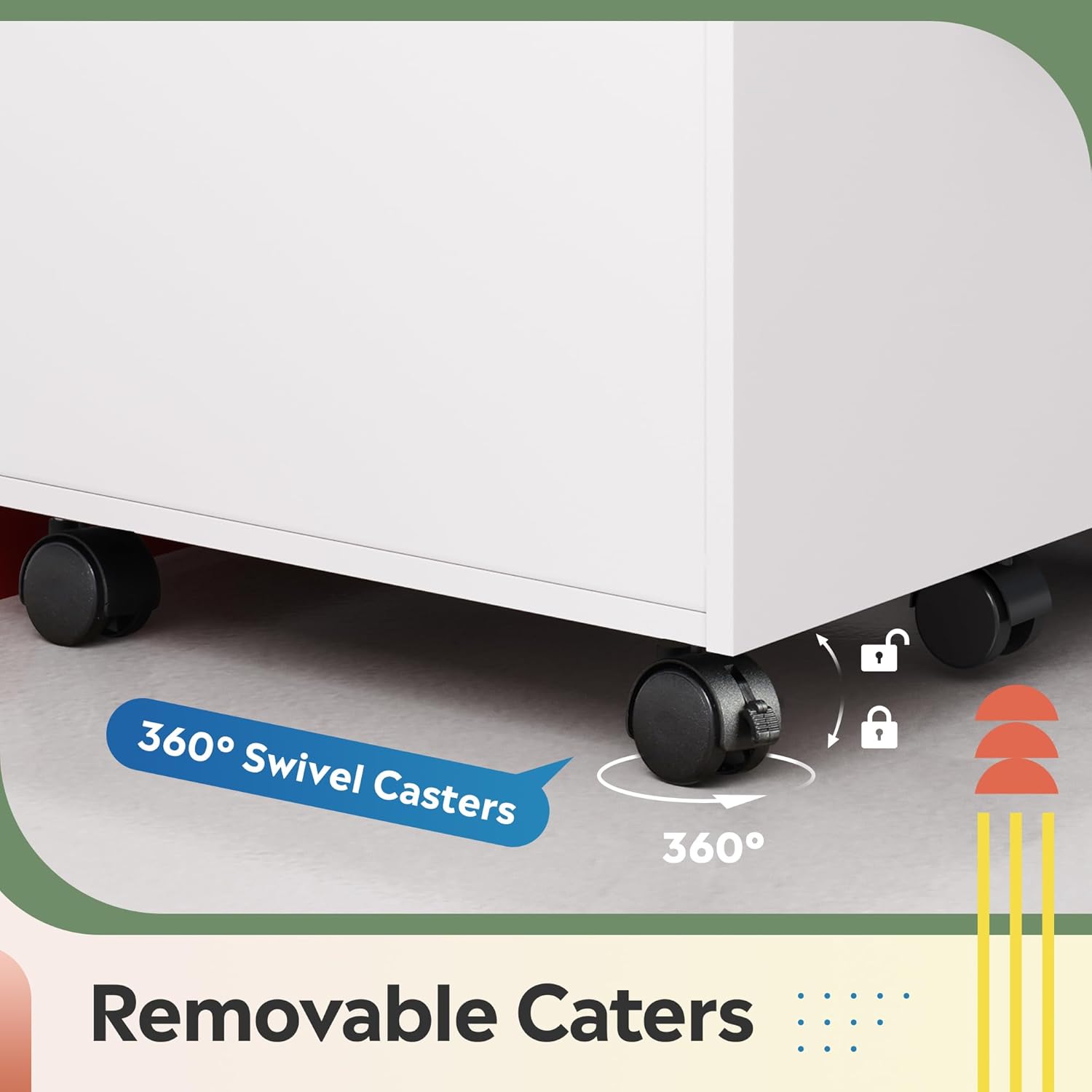 - 【Stability & Mobility】 The file cabinet is equipped with 5 casters for easy movement in your home office. The front two casters have built-in brakes to hold the cabinet in place, while the central anti-tip wheel prevents overturning and enhances stability.