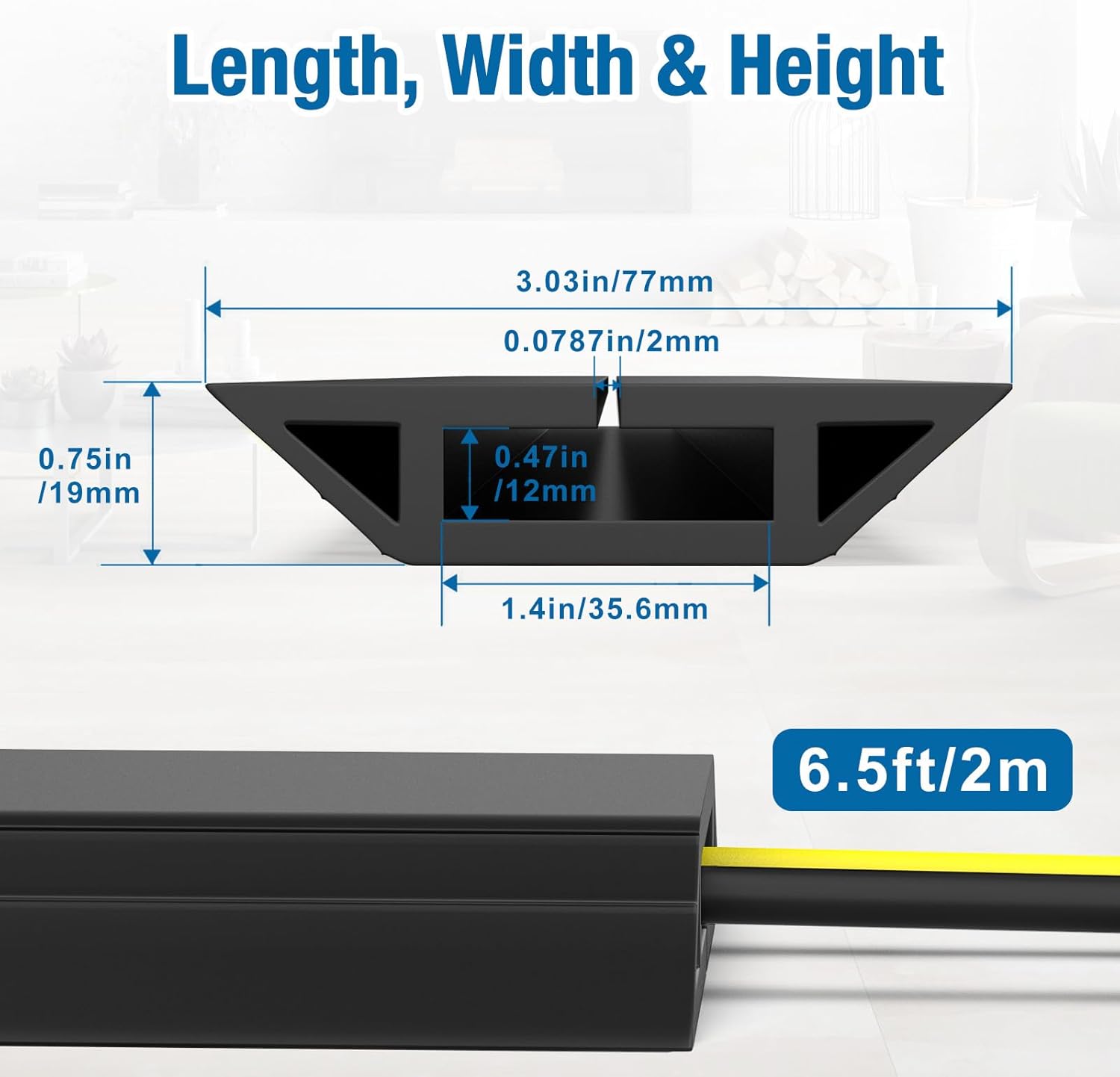 - Cable Protector Floor-- 6.5 feet long, 0.75" Height, 3.03" External width. Extension cord floor cover is long and wide to cover the cables, wires or cords well. Please check the size of your cables or cords first before placing an order