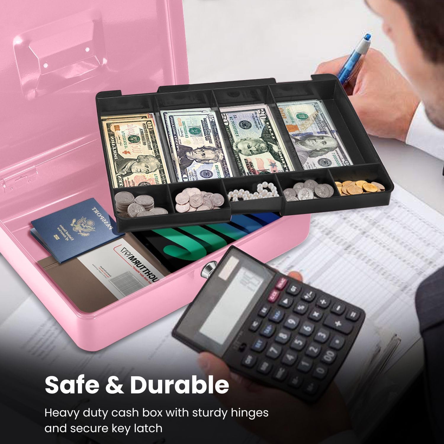 - Organize with Ease - Our money lock box for cash with key features 9 compartment trays to neatly arrange your bills, coins, checks, and other valuables, ensuring quick access and easy counting.