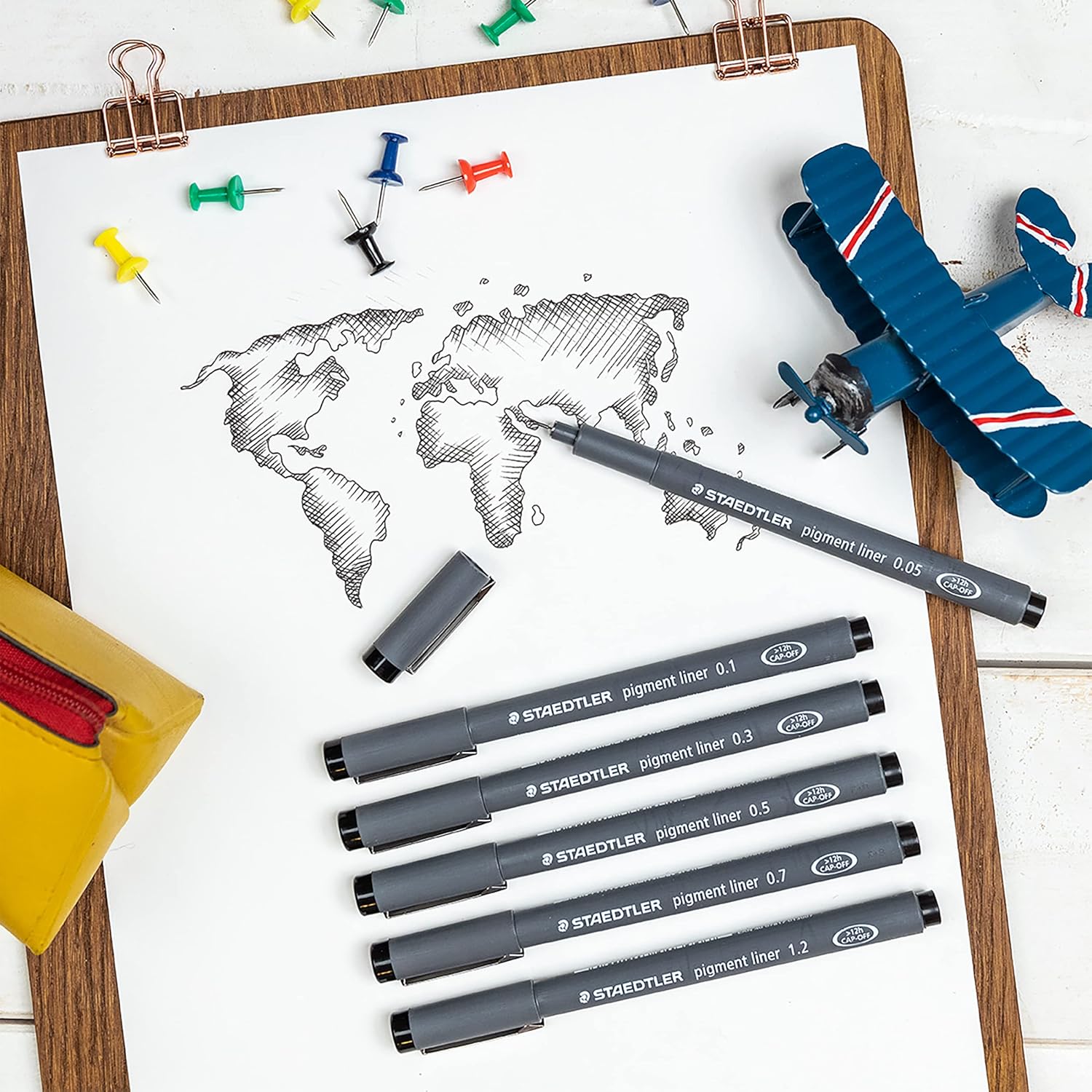 STAEDTLER Pigment Liner Pack, Black, 6 Pens, Assorted Line Widths, 0.05mm, 0.1mm, 0.2mm, 0.3mm, 0.5mm, 0.8mm