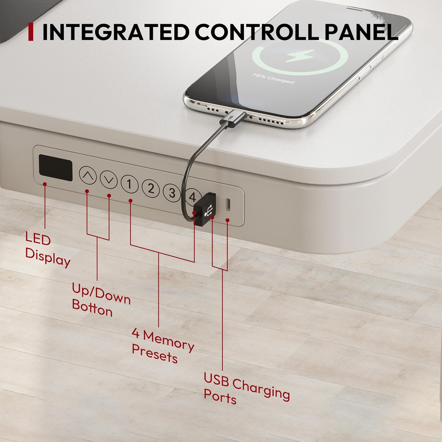 - Embedded Multiple Functions: Easily save multiple with four programmable height presets, a child lock button helps prevent accidental touch. Charge up to three devices with integrated USB ports (Type-C output: 5V2.4A/9V2A/12V1.5A; 2 Type-A output: 3.6-6.5V2.4A/6.5-9V2A/12V1.5A) without mess & hassle. (Note: USB ports may pause charging while adjusting desk height, Laptop charging is not supported).