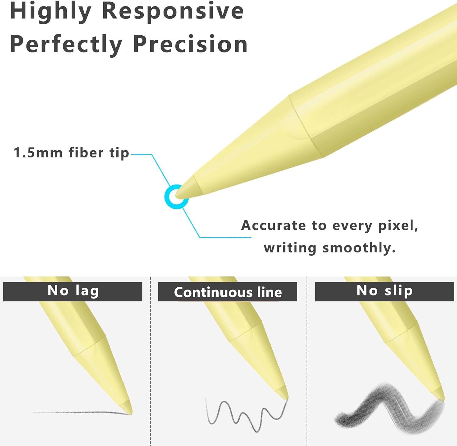 - [High Precision Tip] The iPad pen uses an ultra-fine 1.5 mm tip as a real pen providing small, precise depictions without break and latency to unleash your creativity. The nib is made of newly upgraded material, which is more durable and wear-resistant in use. No PRESSURE-SENSITIVE DESIGN