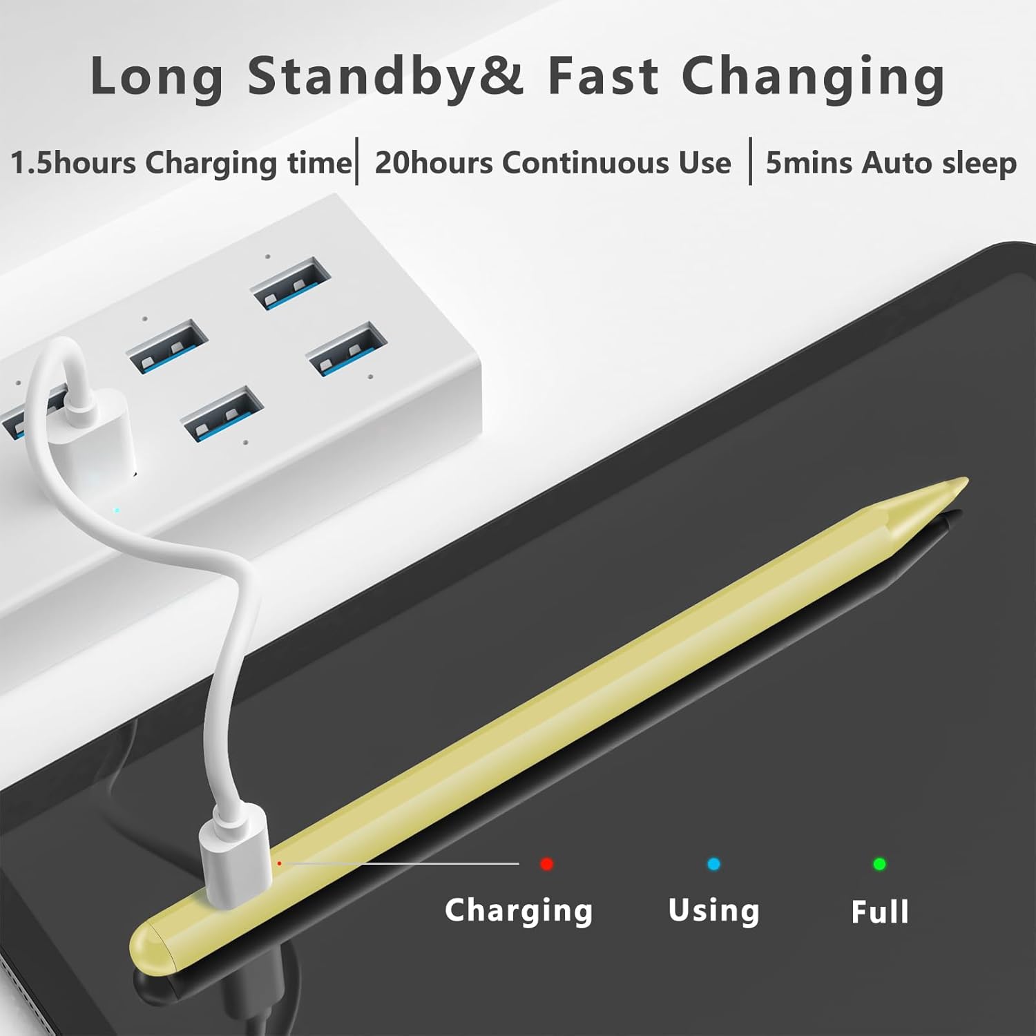 - [ Auto-Sleep Mode ]The stylus pen will automatically enter sleep mode after five minutes of inactivity to save power energy efficiently. Simply touch the top of the pen to wake it up. Using includes a fast-charging USB-C cable that only needs 20 minutes of charging time and supports long-time continuous 15h use.