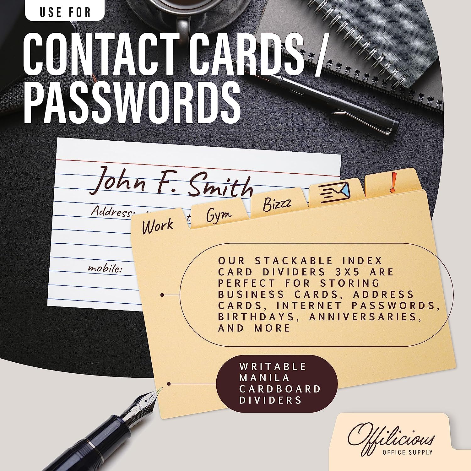 - GET ORGANIZED! WITH MORE FEATURES included than any other a-z index dividers set, our STACKABLE 3x5 recipe dividers are perfect for STORING RECIPES, BUSINESS CARDS, address cards, internet passwords, birthdays, anniversaries, and more – or for organizing FLASHCARDS for kids & students. This chic manila card holder box looks great on your desk or kitchen counter, COMPLIMENTING ANY DECOR STYLE.