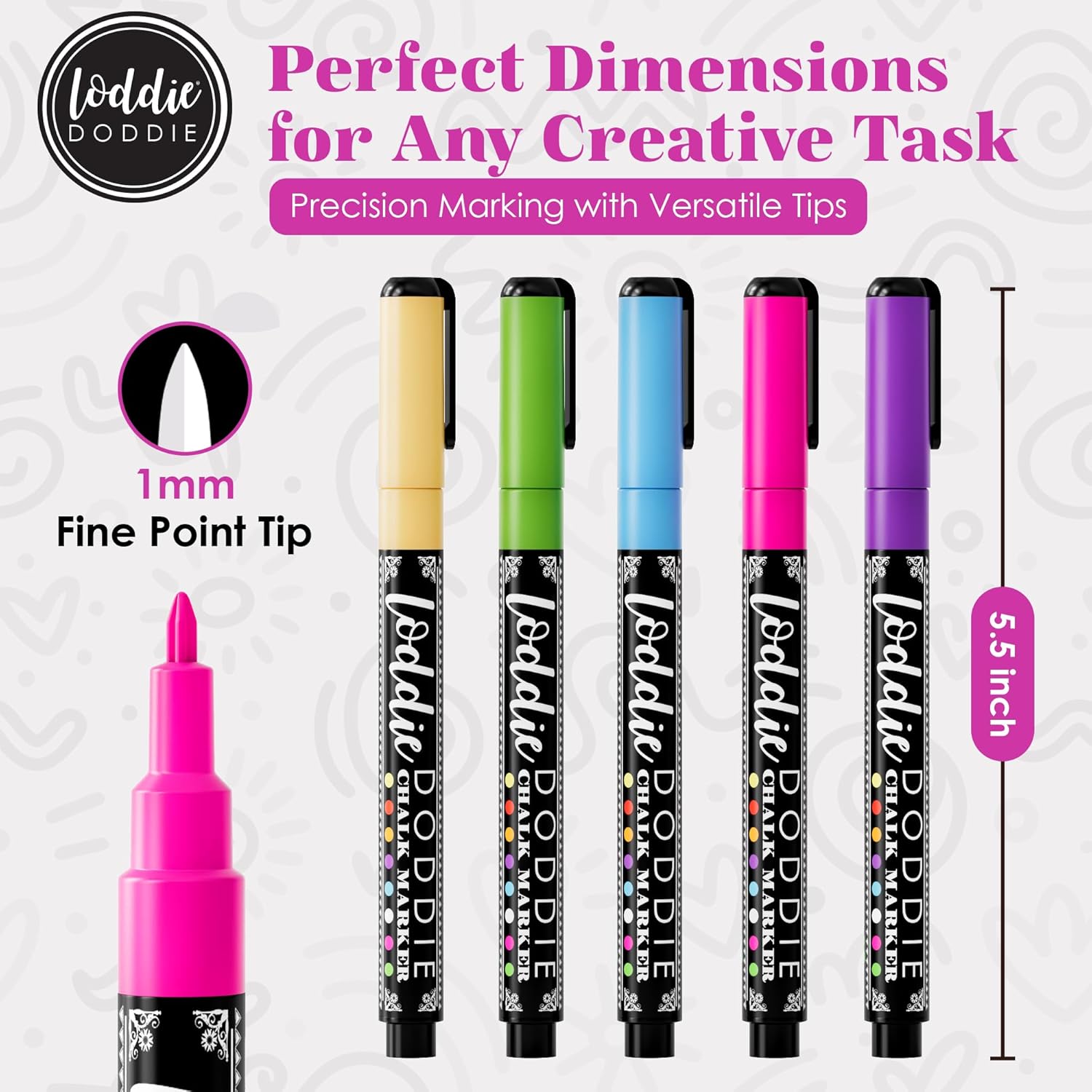 - Easy Erase & Endless Creativity: With our liquid chalk markers erasable, cleaning non-porous surfaces is a snap. Just a splash of water and you're ready to create again. This liquid chalk markers fine tip pack is ideal for storefront displays or festive home touches. Loddie Doddie chalk pens for chalkboard erasable have got you covered