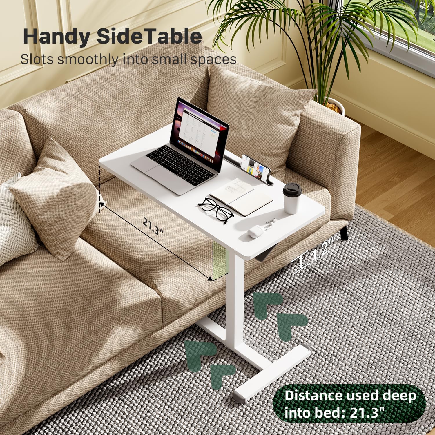 - HIDDEN CASTERS: Rolling standing desk equipped with 4 hidden casters make it move the desk around easily on floors. A low-profile base with smooth rolling wheels eases and tuck beneath furniture minimum 1.2". Can be used as a small workstation next to sofa/ couch or bedside, rolling desk, bed reading tray, or recovery period rolling cart