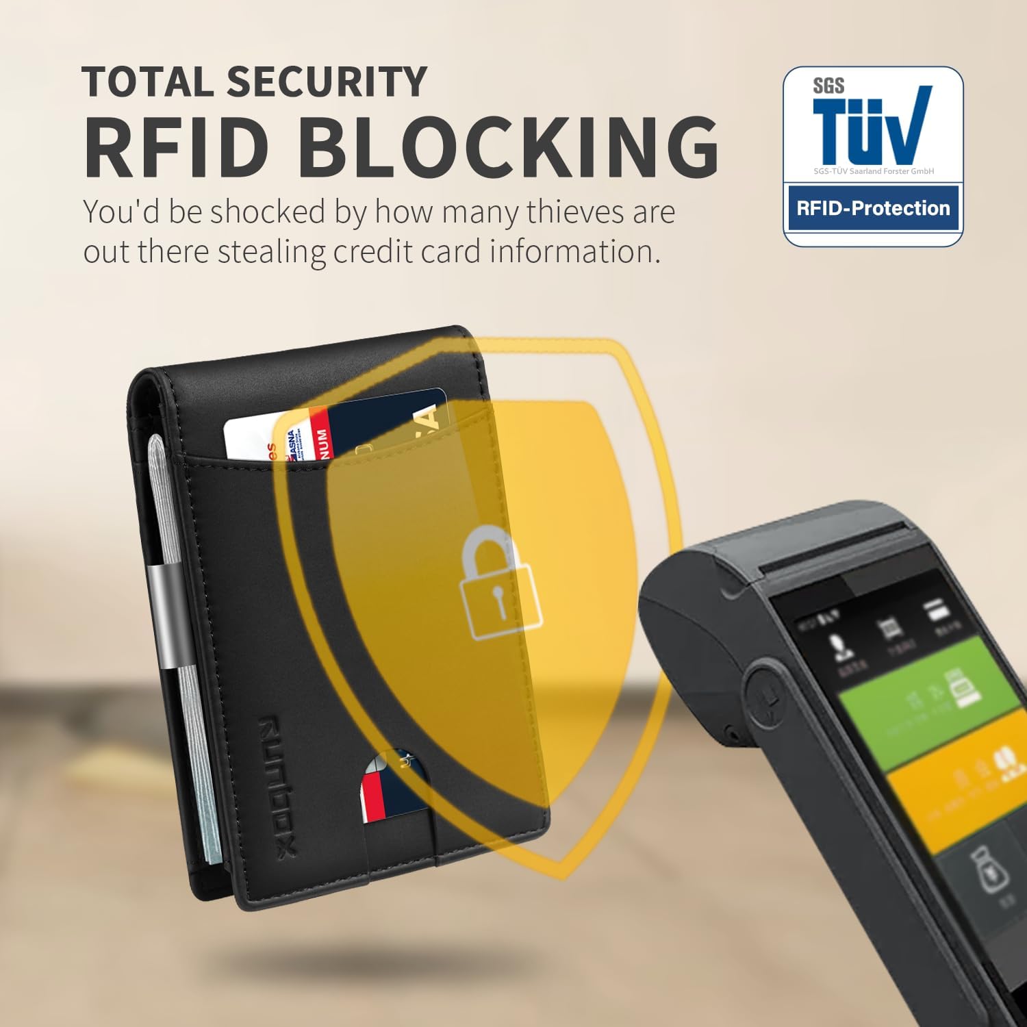 • RFID Anti-Theft SECURITY - This slim wallet for men is equipped with German Institute Certified RFID Security technology, a unique metal composite, engineered specifically to block 13.56 MHz or higher RFID signals to protect the valuable information and privacy