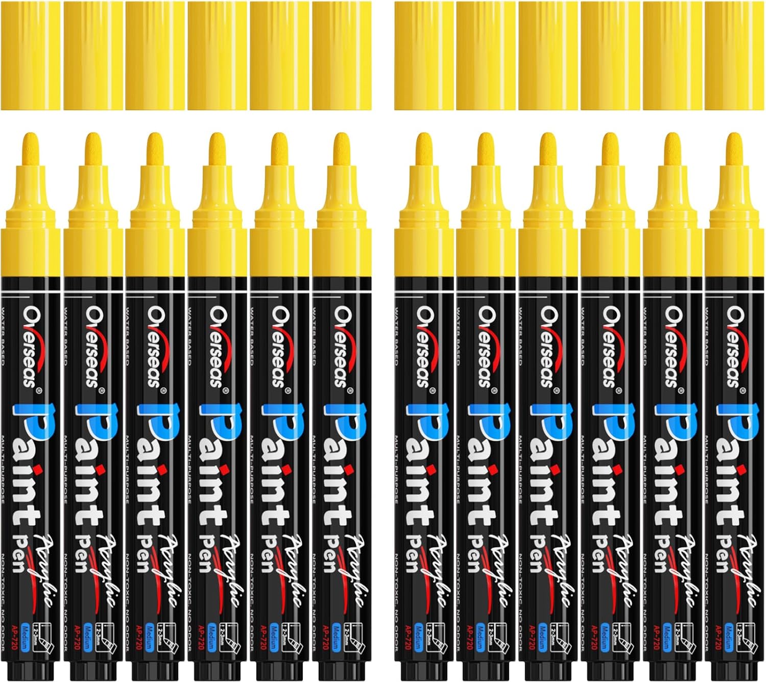 Overseas Yellow Paint Pens Paint Markers - Permanent Acrylic Markers 12 Pack, Water-Based, Quick Dry, Waterproof Marker Pen for Rock, Wood, Plastic, Metal, Canvas, Glass, Mugs. Medium Tip
