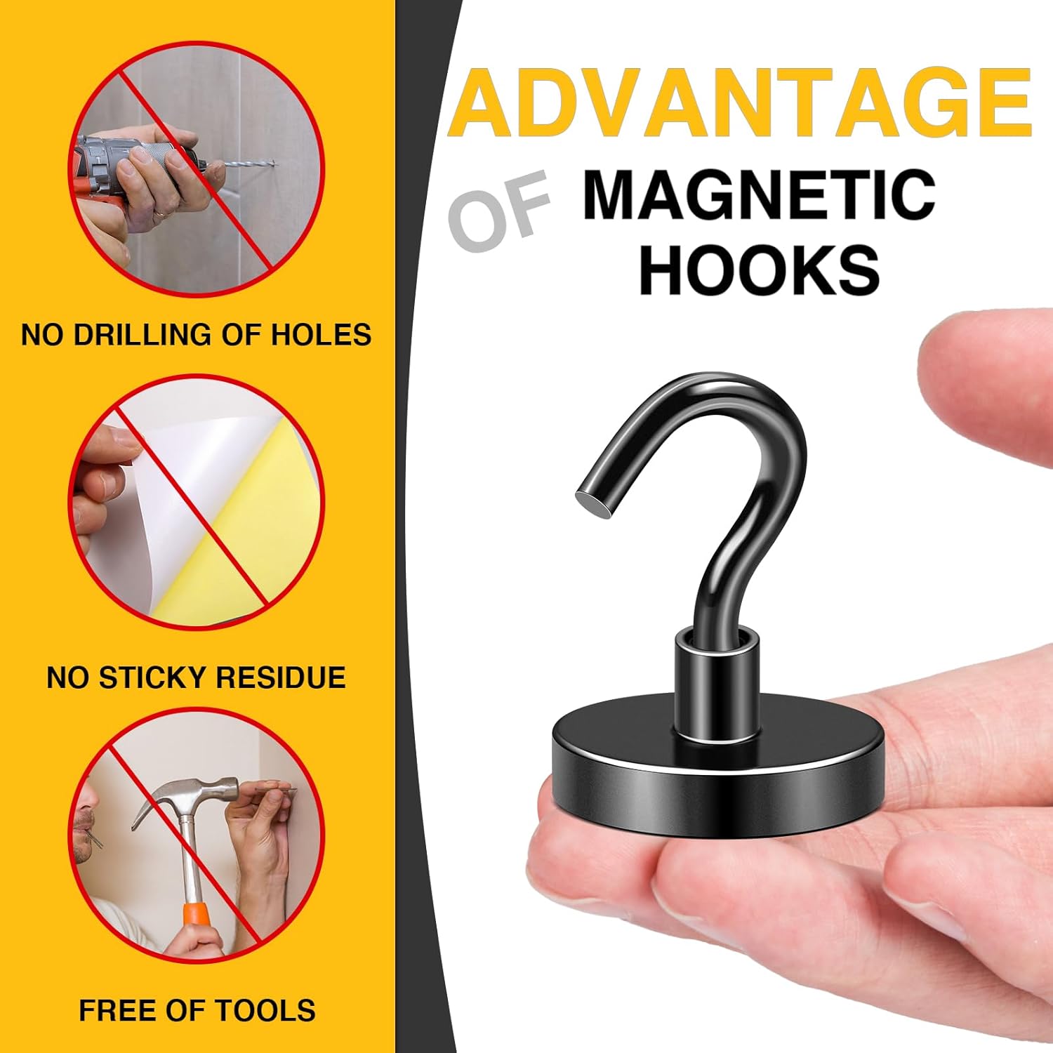 - 【Versatile Use】Black magnetic rare earth neodymium hooks are perfect for hanging grill tools, decorative lights and tool accessories, also be widely used in cruise, home, kitchen, workplace office, garage, indoor, outdoor and anywhere there is iron or steel. No drilling holes, No sticky residue, No bolt or screws; Easy to install or remove and reusable