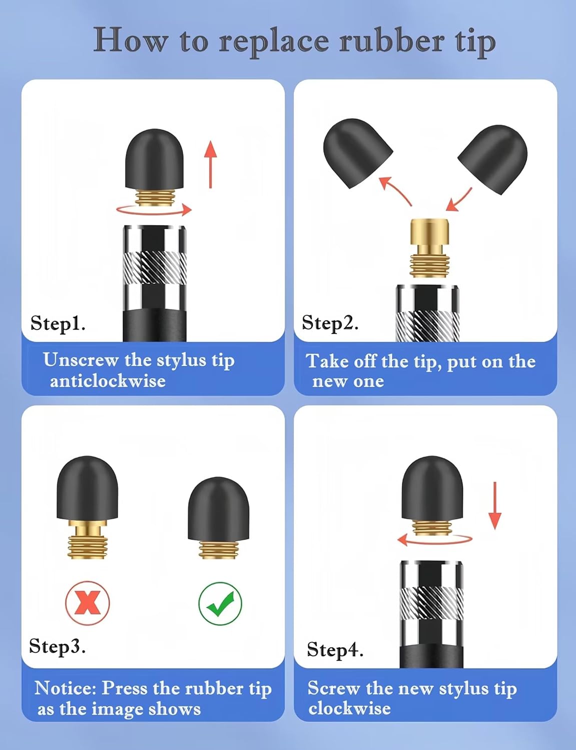 - 【Easy to replace rubber tips】Both two ends of rubber tips are replaceable. Replacing can be done within seconds without any tool, Package contains 6* stylus Pens and 12 replaceable rubber tips included (6* 0.20'' rubber tips and 6* 0.27'' rubber tips).