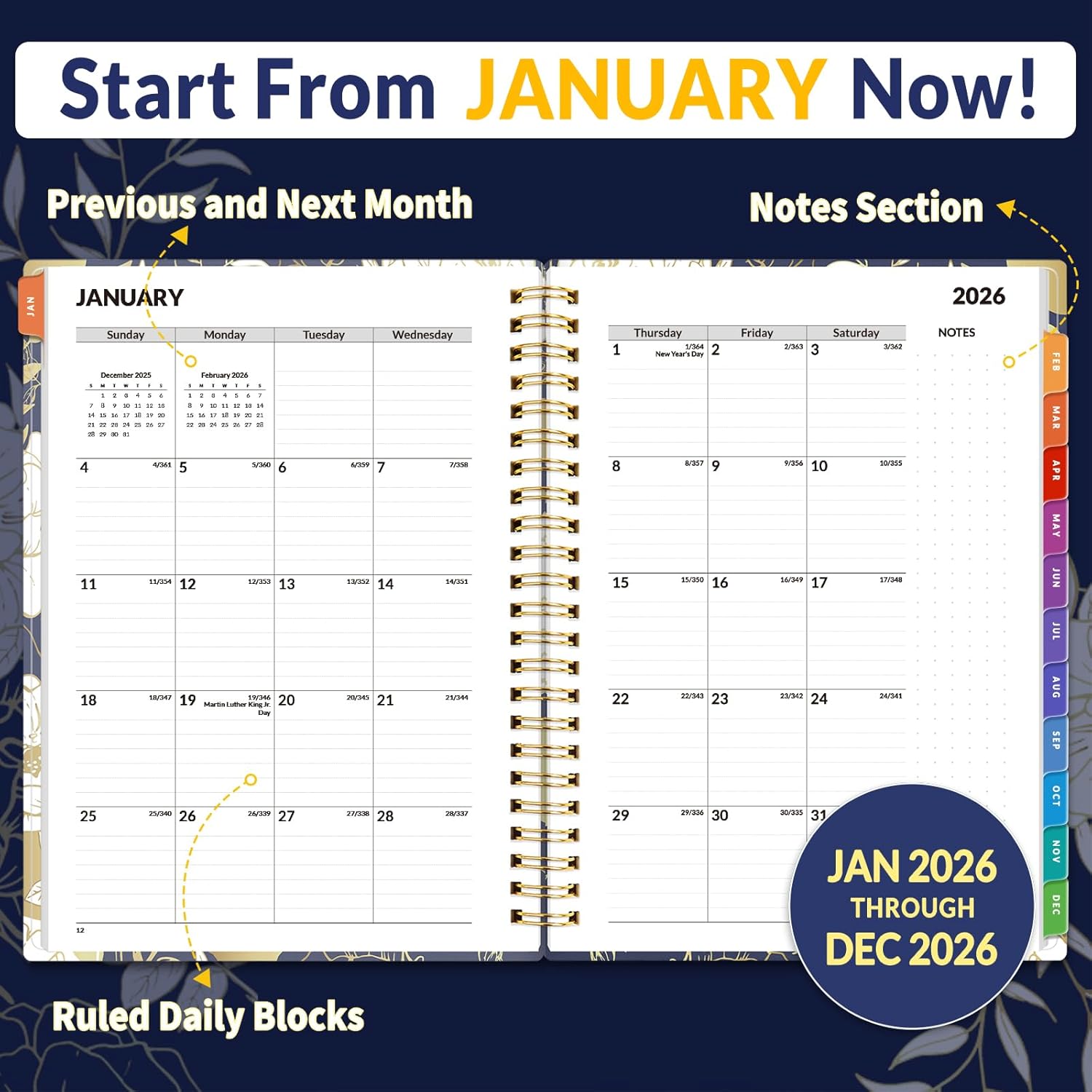 - Monthly View - Each date box provides ample writing space and includes the previous and next month's reference, ruled daily blocks with popular holidays, and Julian Dates for easy long-term project and appointment scheduling.