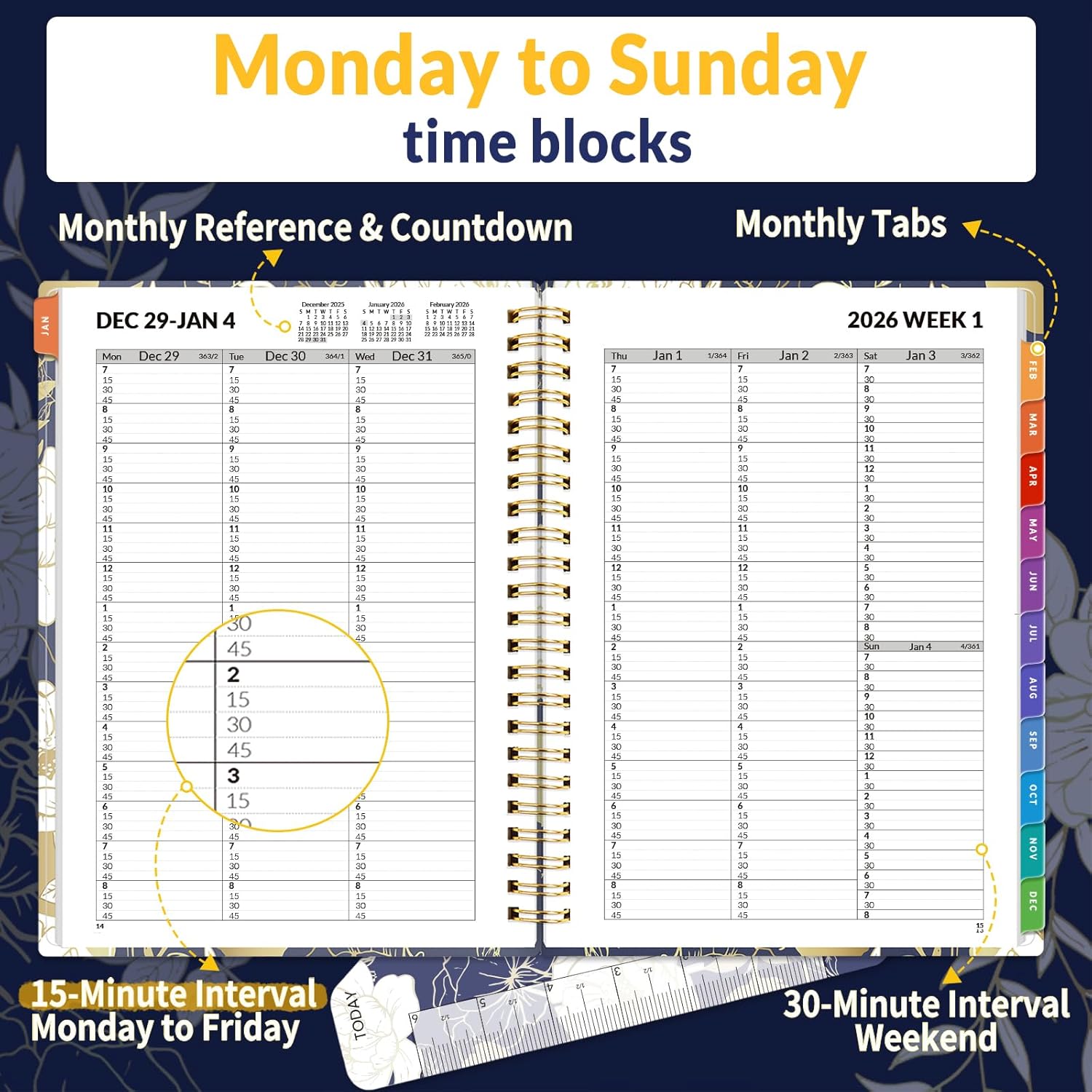 SUNEE 2026 Appointment Book, Quarter-Hourly, Weekly & Monthly - from January 2026 - December 2026, 6.4"x8.3" Flexible Cover, Notes, Pockets, Bookmark, Spiral Binding, Vintage Floral