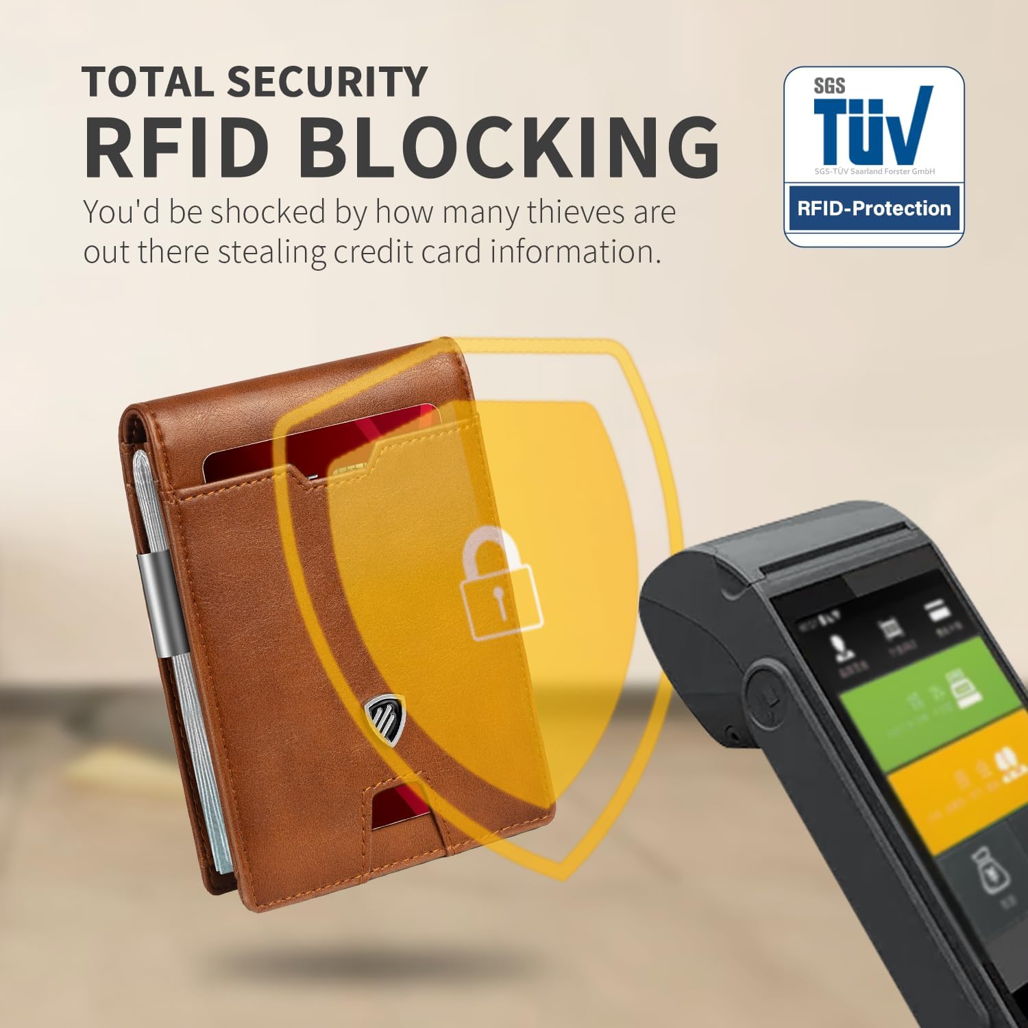 - RFID Blocking Protection - This rfid wallet for men is tested by an independent German quality control institute, specifically to block 13.56 MHz or higher RFID signals and protect against data theft by RFID scanners