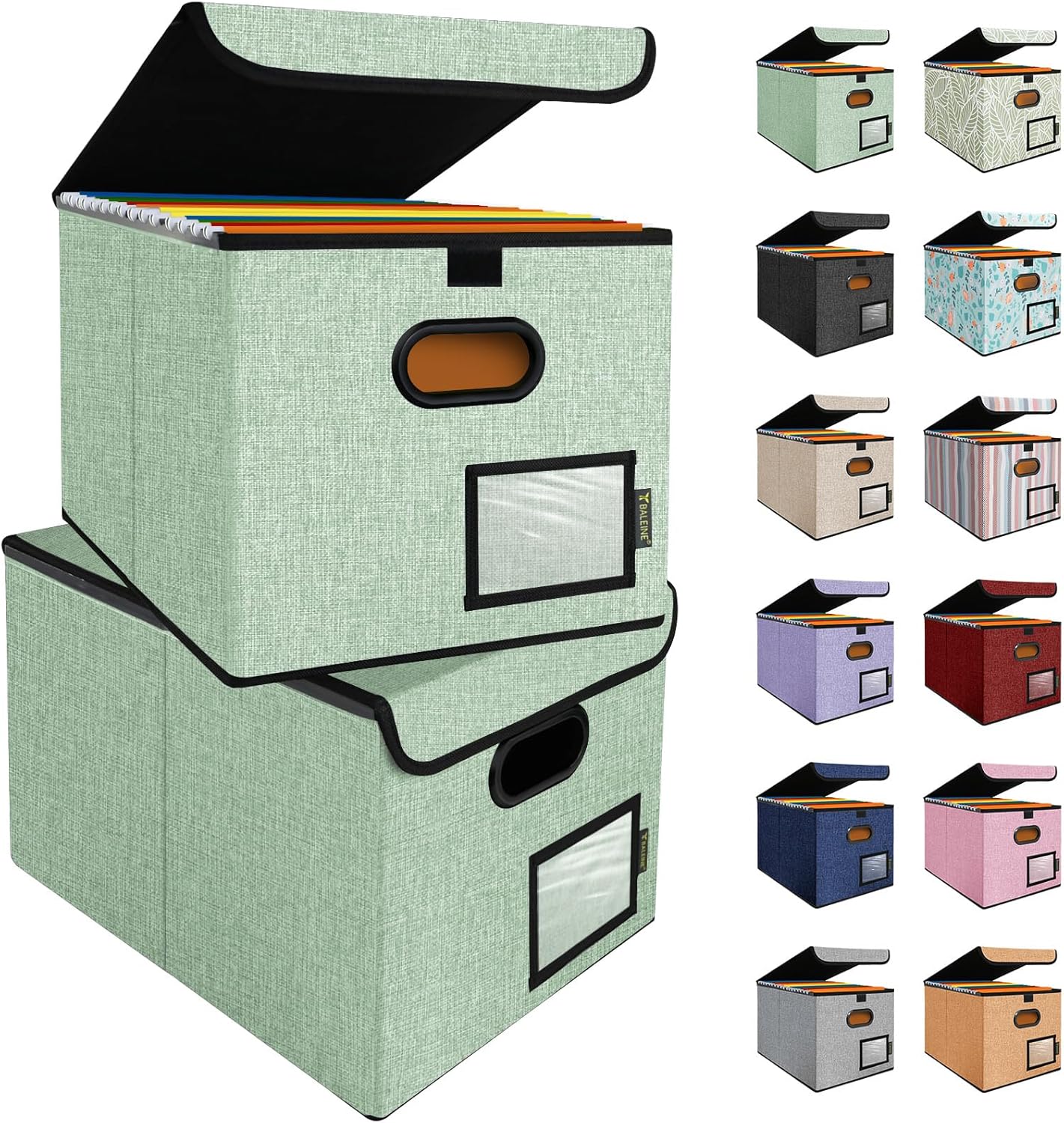BALEINE File Organizer Box with Lid, Collapsible File Folder Organizer with Plastic Slide, Hanging File Folder Box for Office Document Storage (2 Pack, Green)