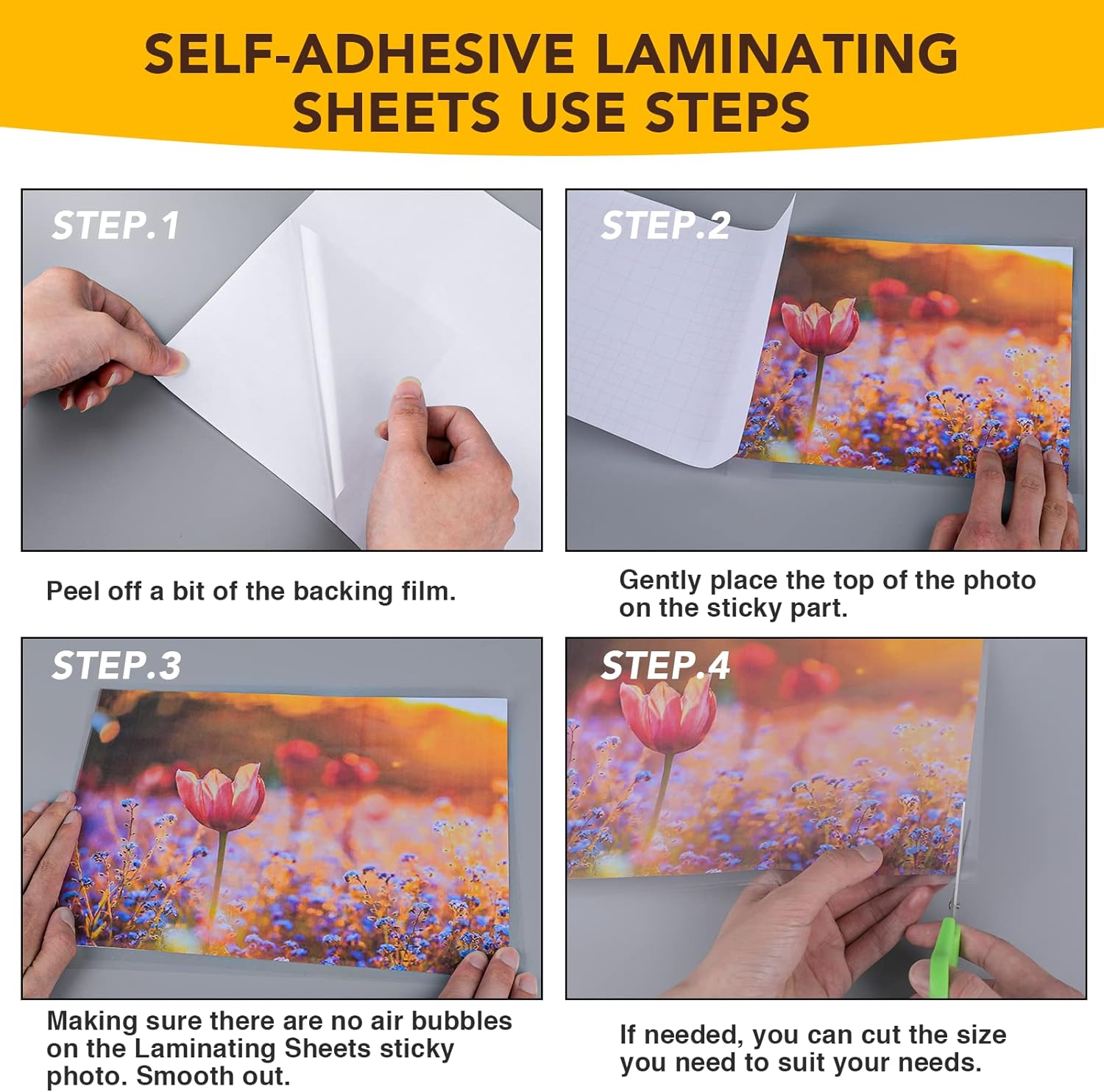 - Premium Material: Our self-adhesive laminating sheets are made of high quality material, thin and transparent, with good adhesion, it can cover paper and photos perfectly, provide long time protection and avoid fading and damage. Notice: The strong adhesion makes it hard to adjust the position once attached, please fix exactly what you want to laminate
