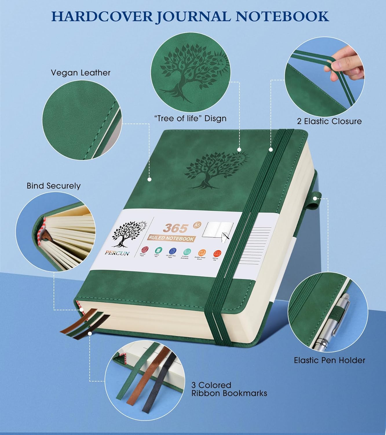 - 【365 Pages Premium Thick Paper】: Our PERCUN lined journal notebook is made of 365 pages high-quality 100Gsm thick ruled pager with an acid-free light Ivory paper that is thicker than normal. This premium quality paper will not cause bleeding, ghosting or smudging and is suitable for most types of pens,provides ample space for journaling, note-taking, and creative writing. The line spacing is 7mm, making it easy to write legibly and neatly.